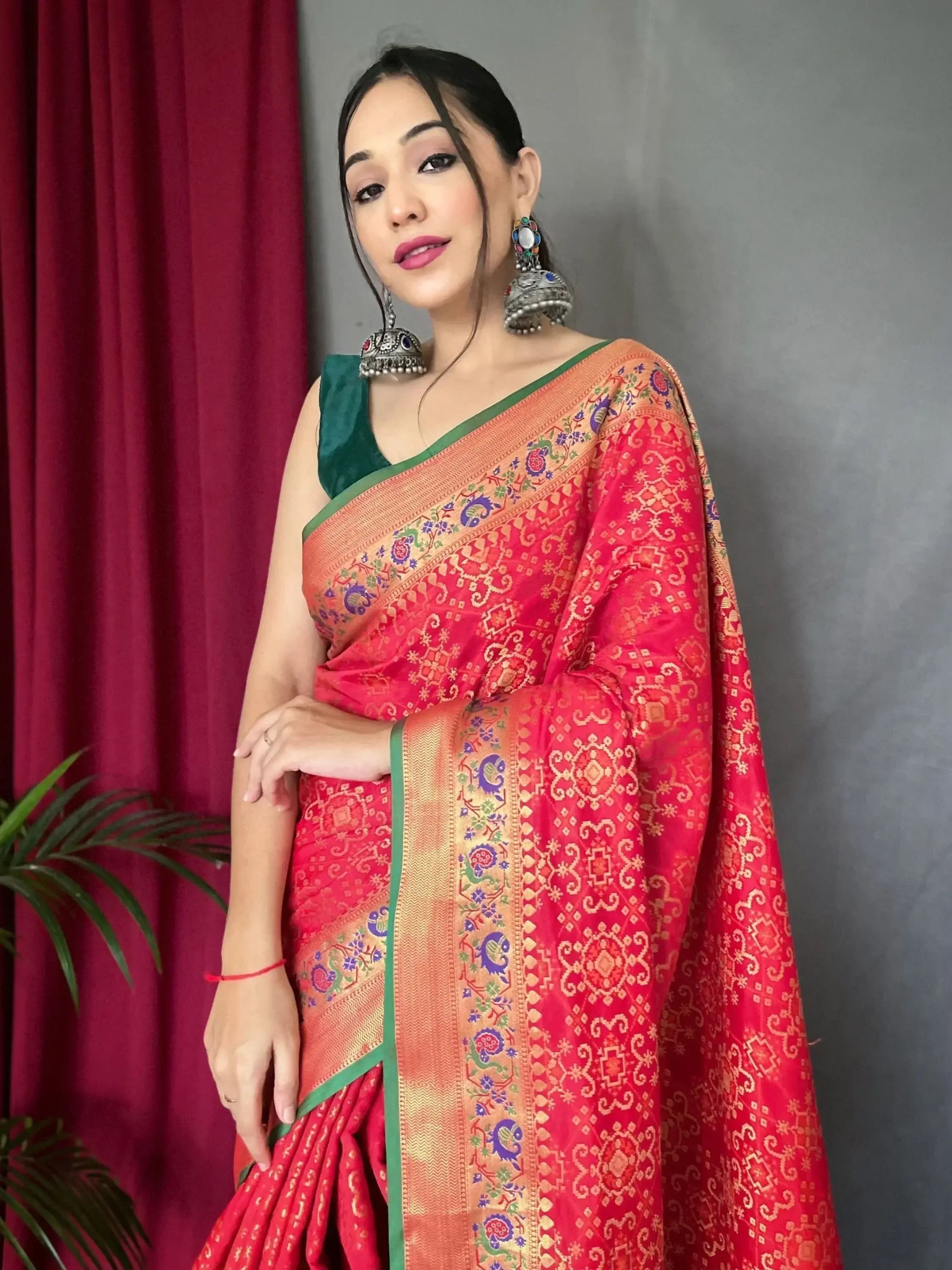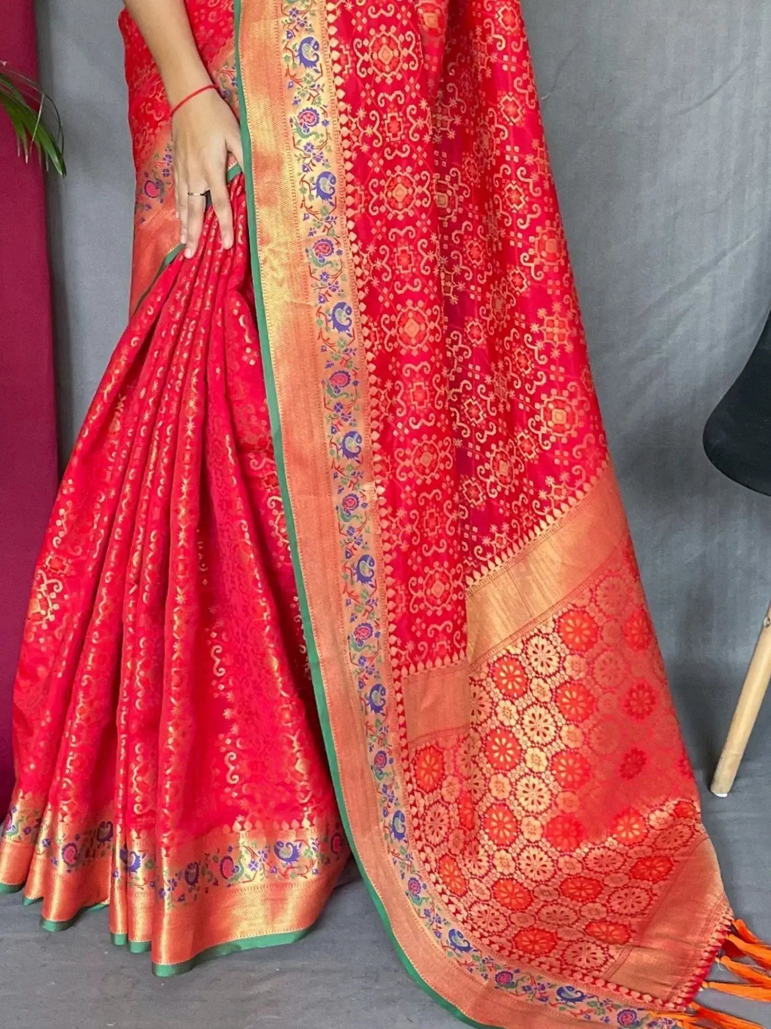 Introducing the epitome of elegance and tradition, this red silk saree adorned with exquisite patola print work, intricate zari detailing, and a luxurious rich pallu with attached tassels is a timeless addition to any woman's wardrobe. Crafted with meticulous attention to detail, this saree exudes sophistication and charm, perfect for elevating your look at festivals, weddings, and special occasions.