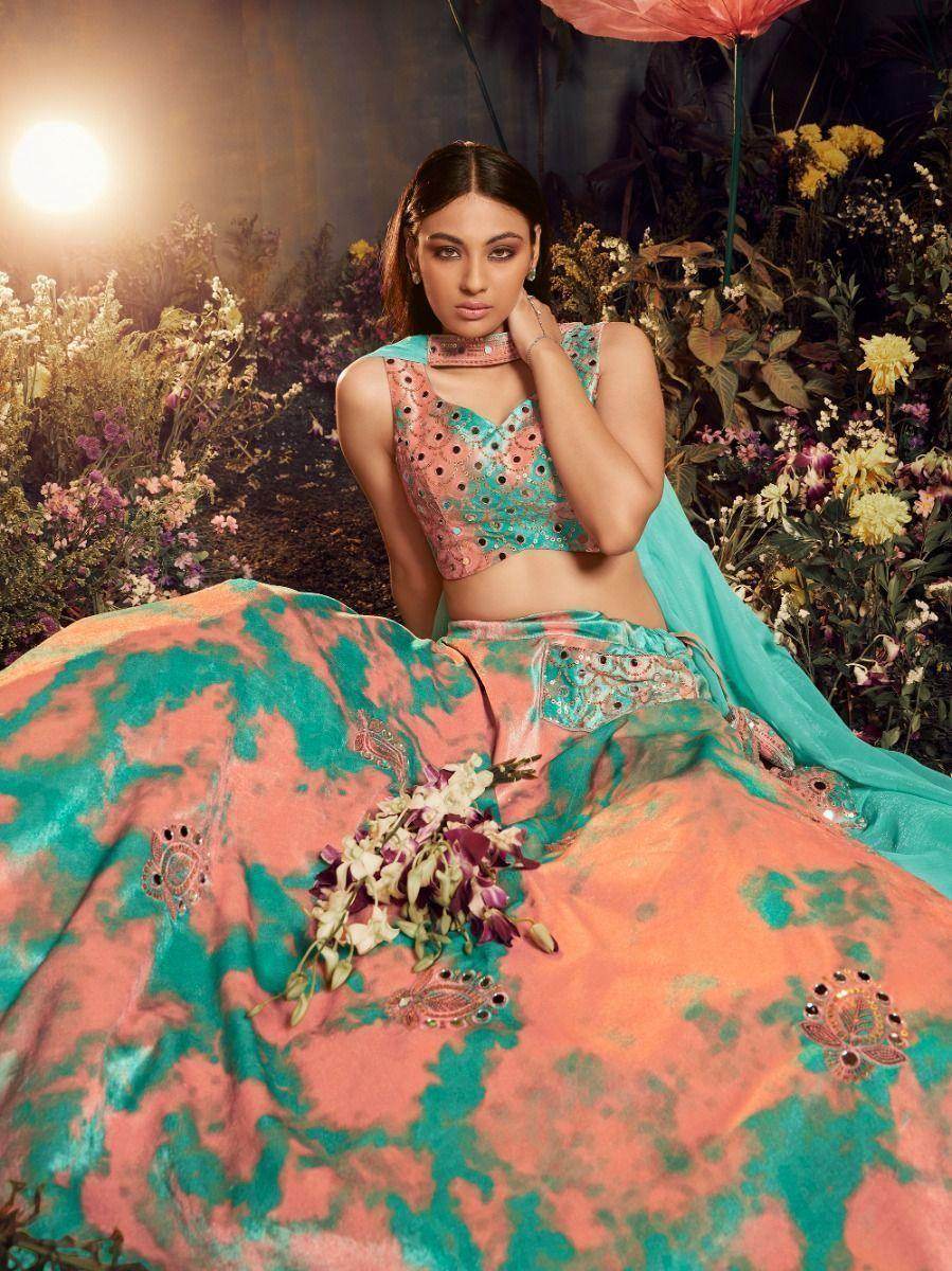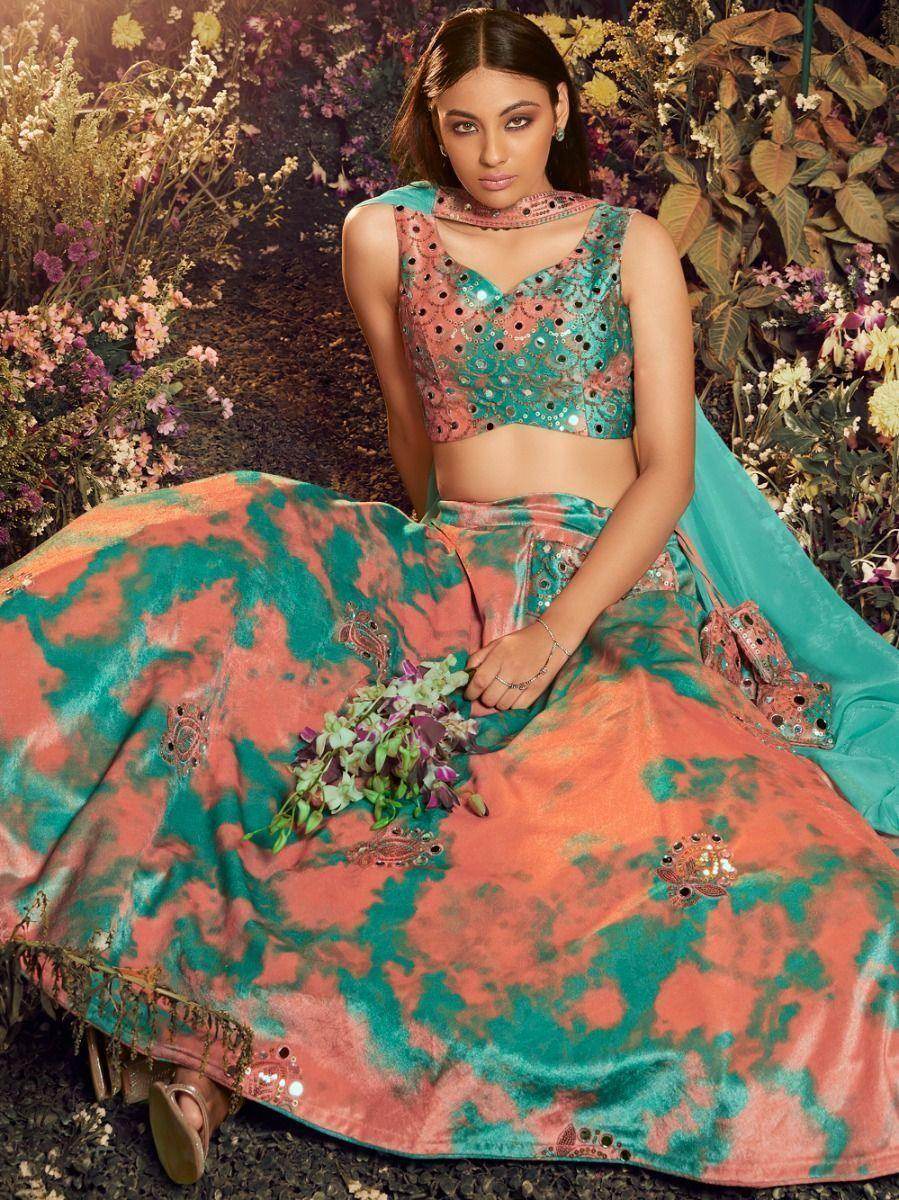 Get a contemporary yet modern look by wearing this striking Turquoise-Orange color lehenga crafted with velvet material finished with sibburi print with sequins embroidery and mirror work and also comes with tassels.