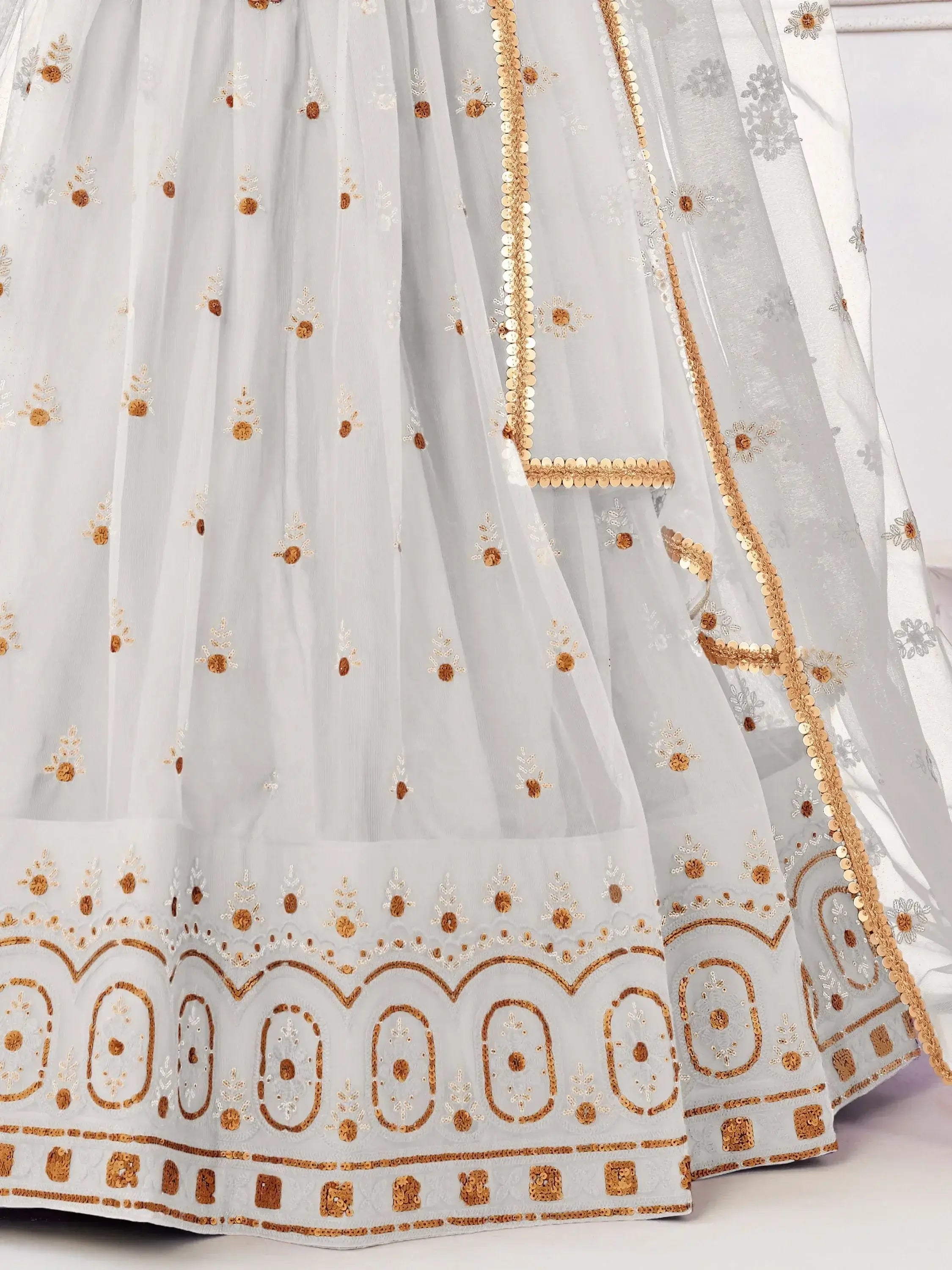 Introducing our exquisite "beautiful white sequins net festival wear lehenga choli with dupatta", a stunning ensemble that will make you stand out at any special occasion. This beautiful white lehenga features intricate embroidered work, thread work, and sequin work on butterfly net material, giving it a graceful and elegant look. The accompanying choli and dupatta are crafted from similar color butterfly net material with matching embroidered work and sequin details.