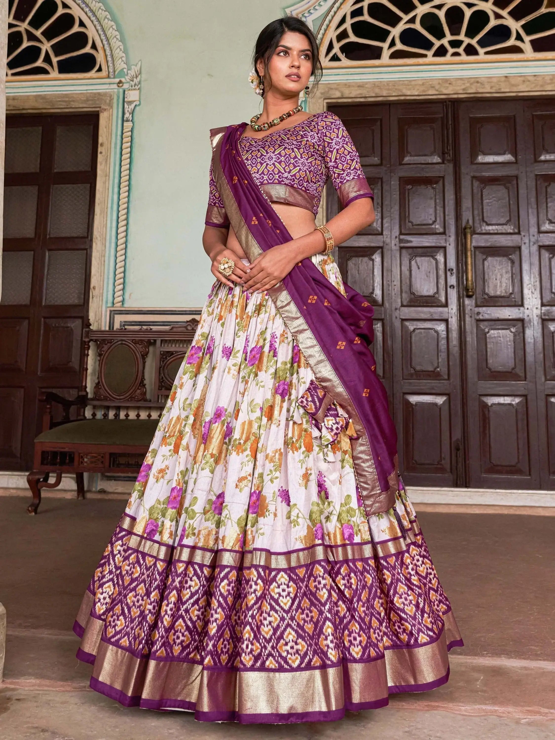Our "beautiful white & wine floral printed silk Navaratri wear lehenga choli" is a must-have addition to your ethnic wear collection. Make a statement at any special event by draping this beautiful lehenga choli and pairing it with stylish accessories. Don't miss out on this exquisite ensemble that is sure to make you the center of attention wherever you go.