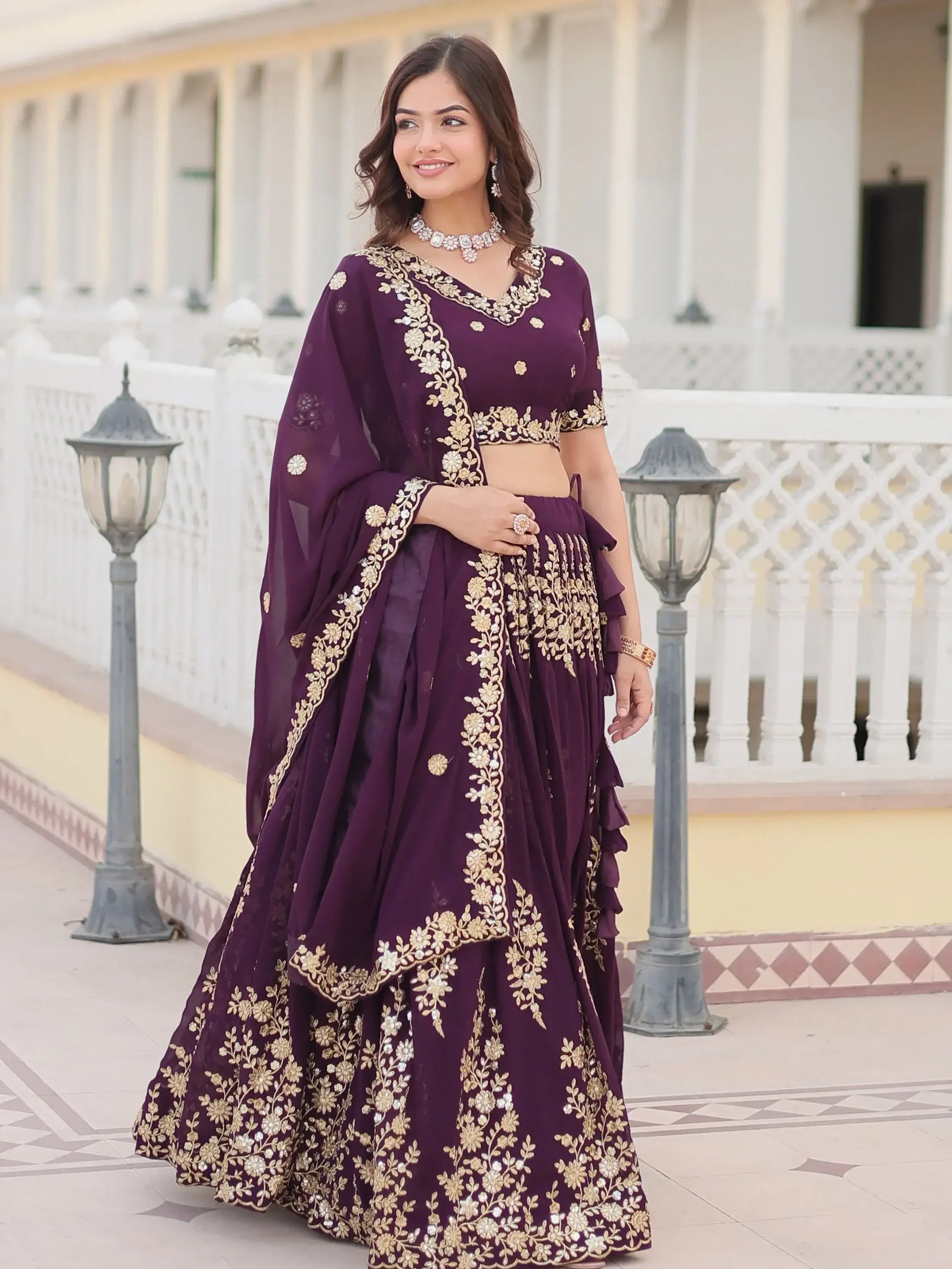 Drape this wine lehenga choli at events and occasions to make a lasting impression. Pair it with a trendy bun and a set of heels to elevate your look and make your special day even more memorable. Whether you're attending a wedding or a festive celebration, this beautiful wine sequined georgette wedding lehenga choli is the perfect choice for a sophisticated and stylish ensemble.