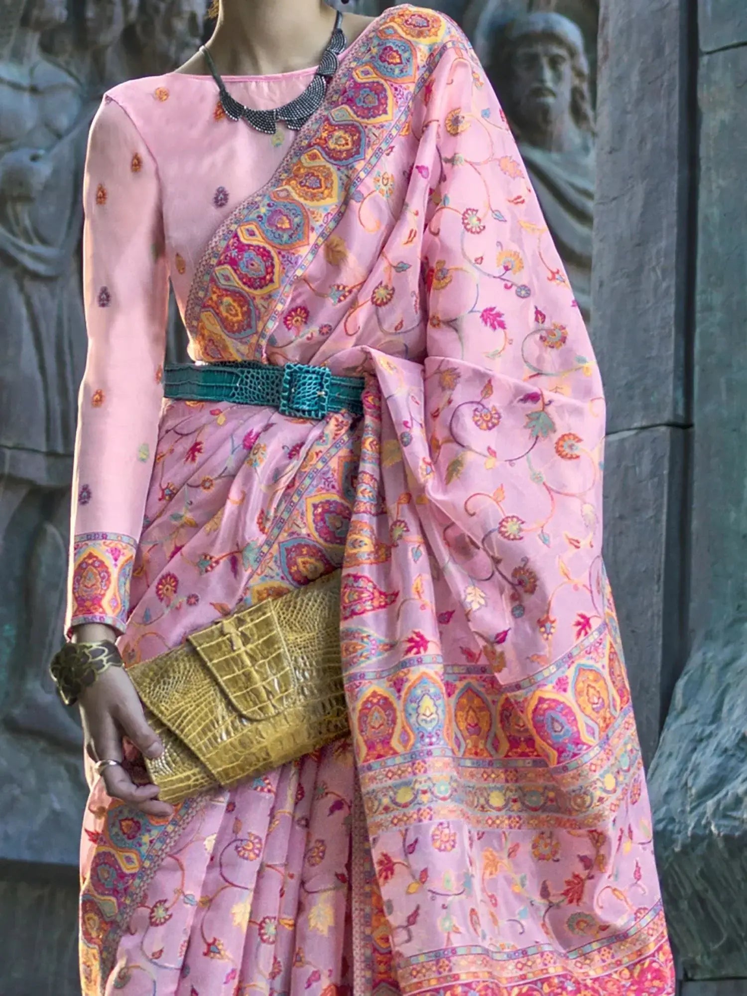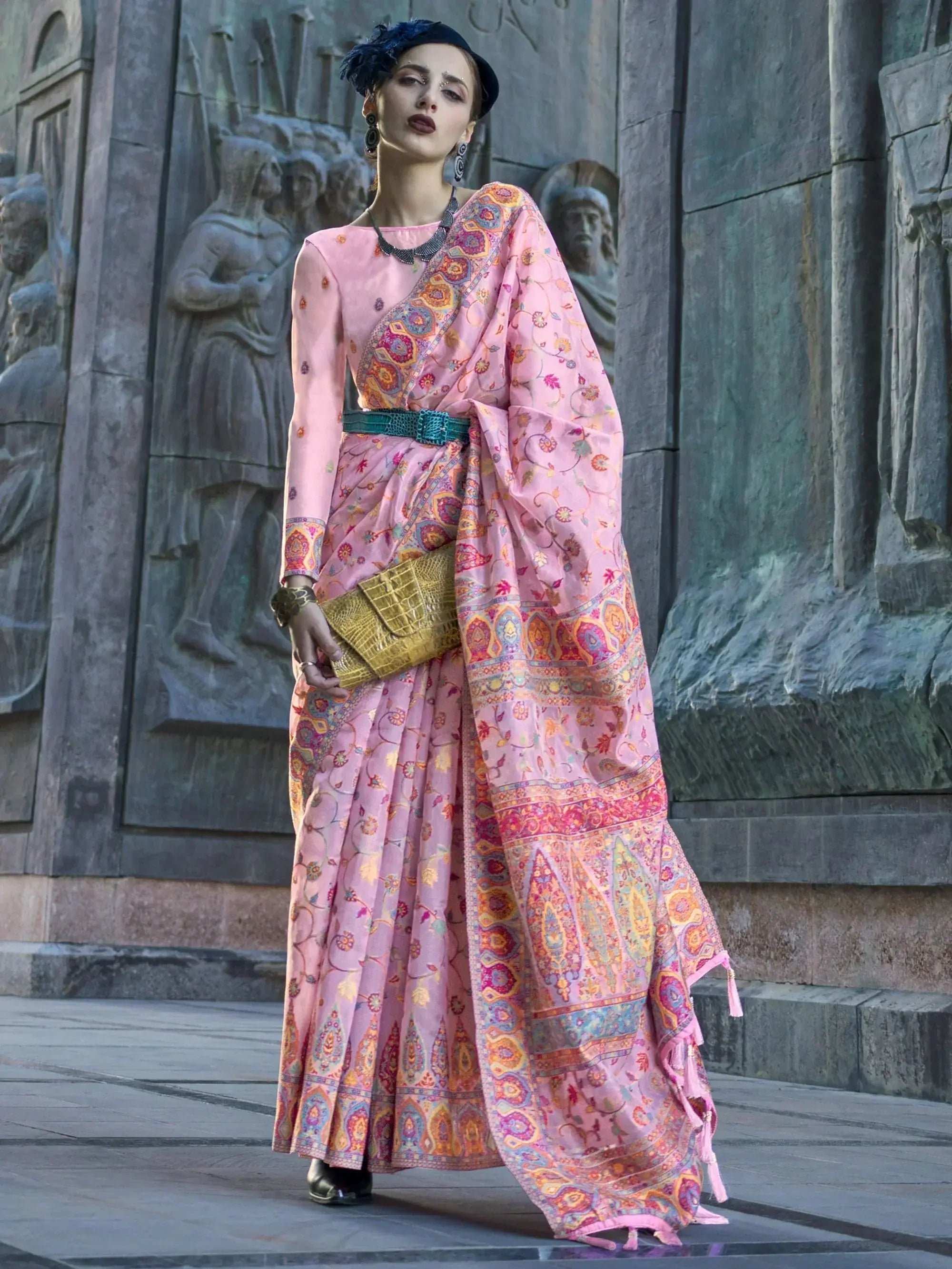 This saree includes its mesmerizing weaving work, which adds a touch of shimmer and glamour. The baby pink color is versatile and easy to style, allowing you to experiment with different accessories and jewelry. The soft and breathable organza material ensures comfort while maintaining a luxurious look.