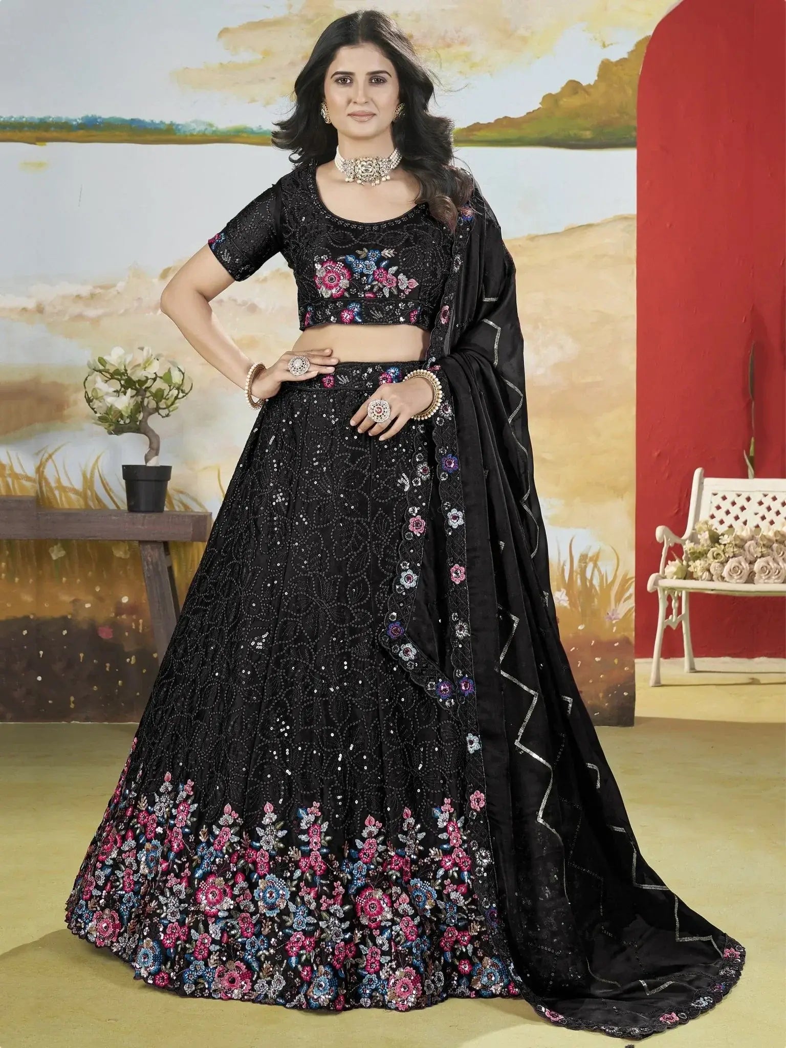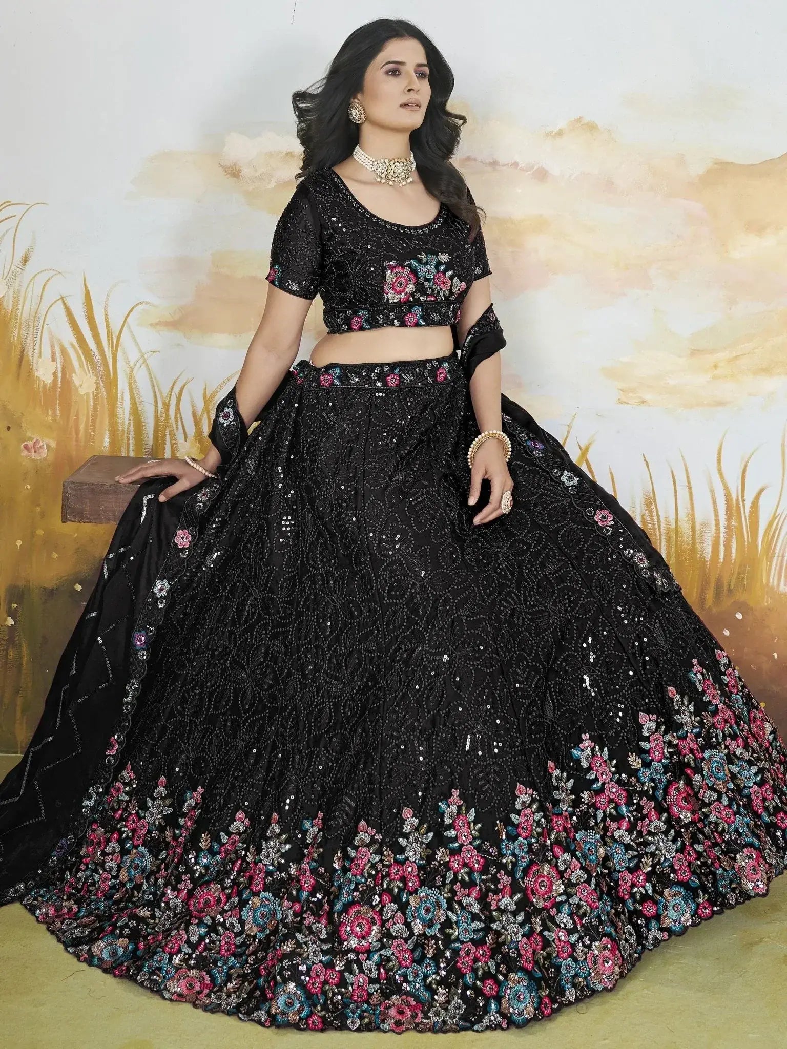 This enchanting black sequins chinon reception wear lehenga choli. Crafted with intricate thread and floral embroidered work, along with stunning sequin embellishments, this set exudes elegance and glamour.