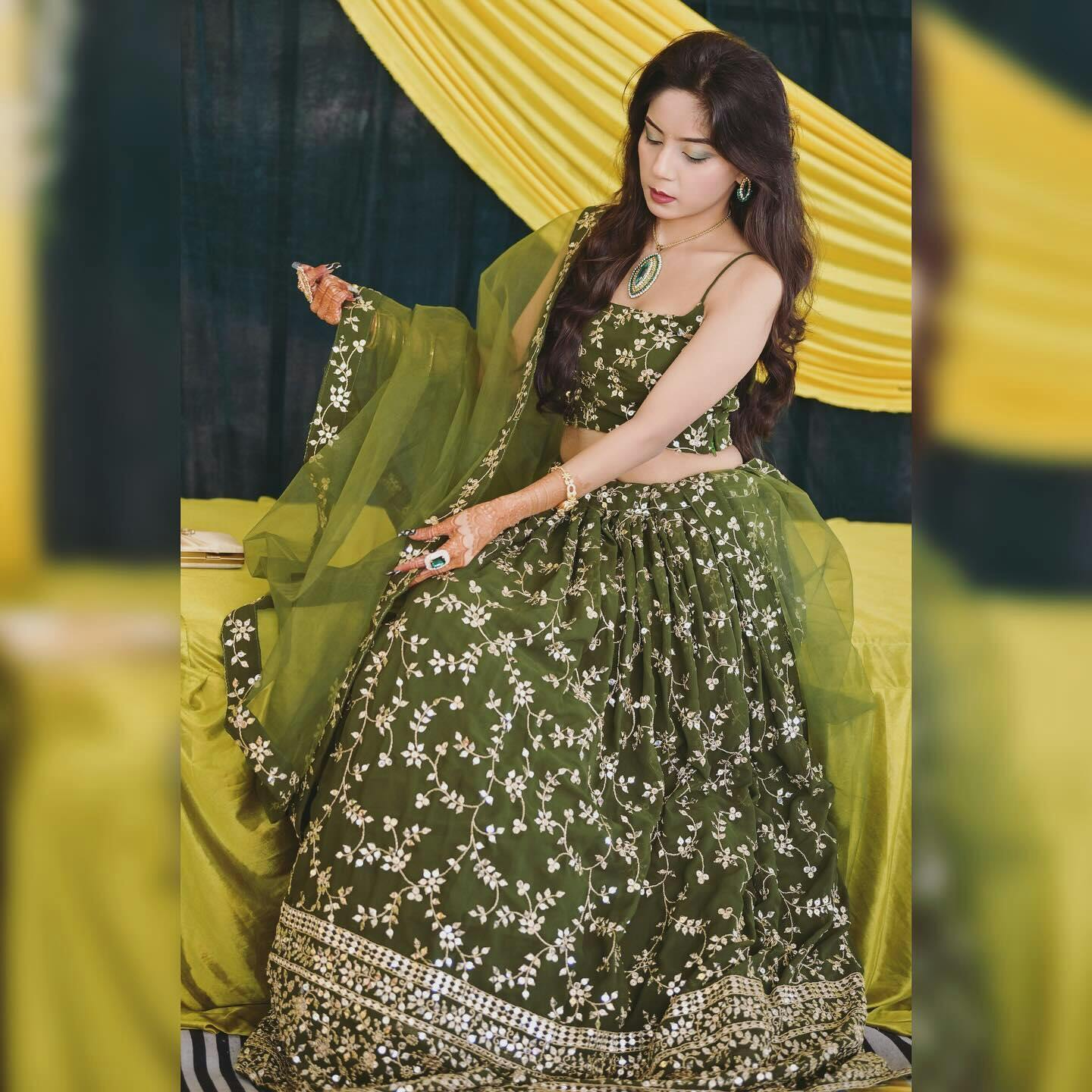Whether you're the bride, a bridesmaid, or simply a guest, this bewitching green embroidered georgette mehendi lehenga choli will make you the center of attention. Its timeless design and exquisite craftsmanship ensure that you look stunning and elegant on your special day.
