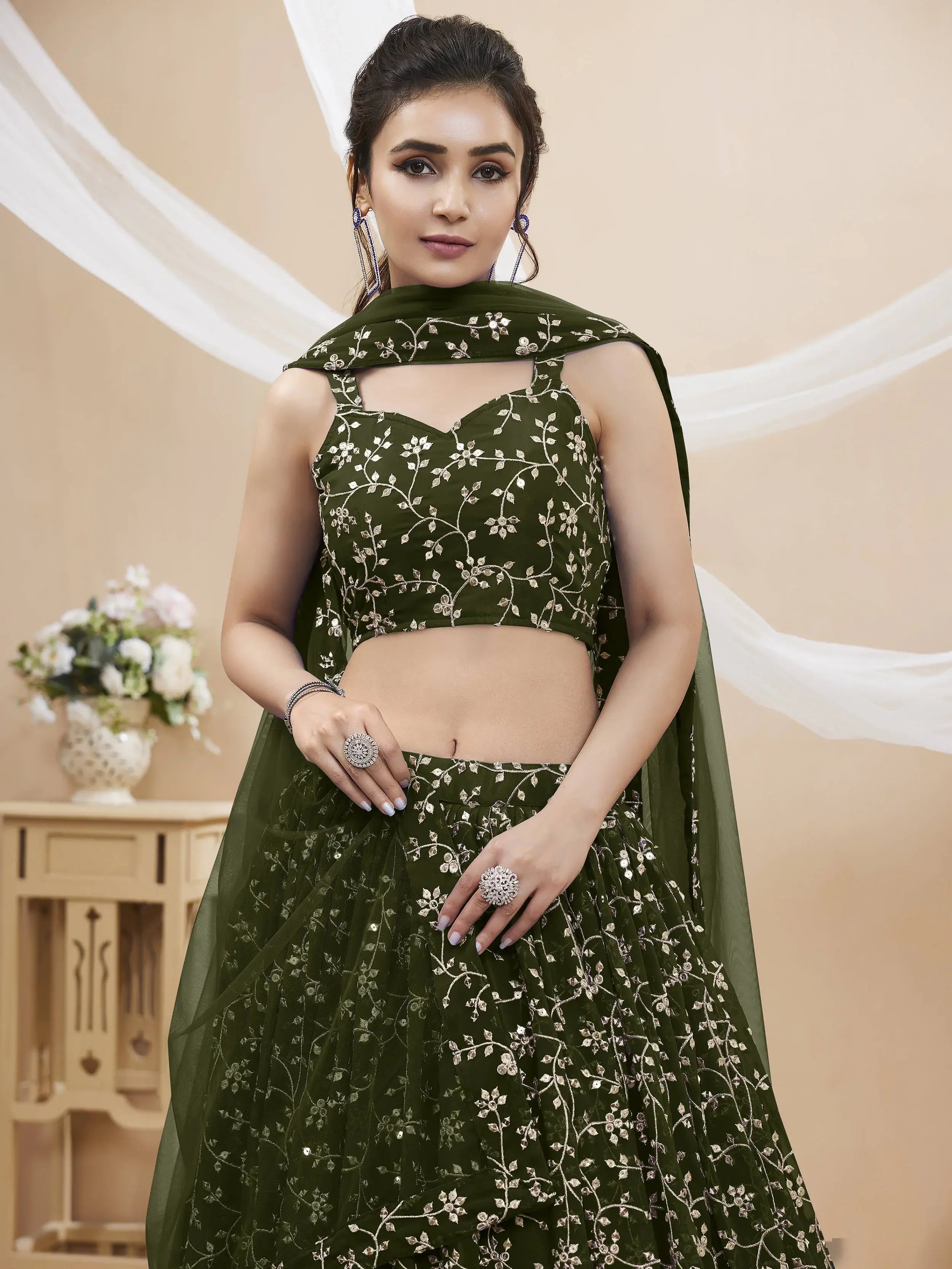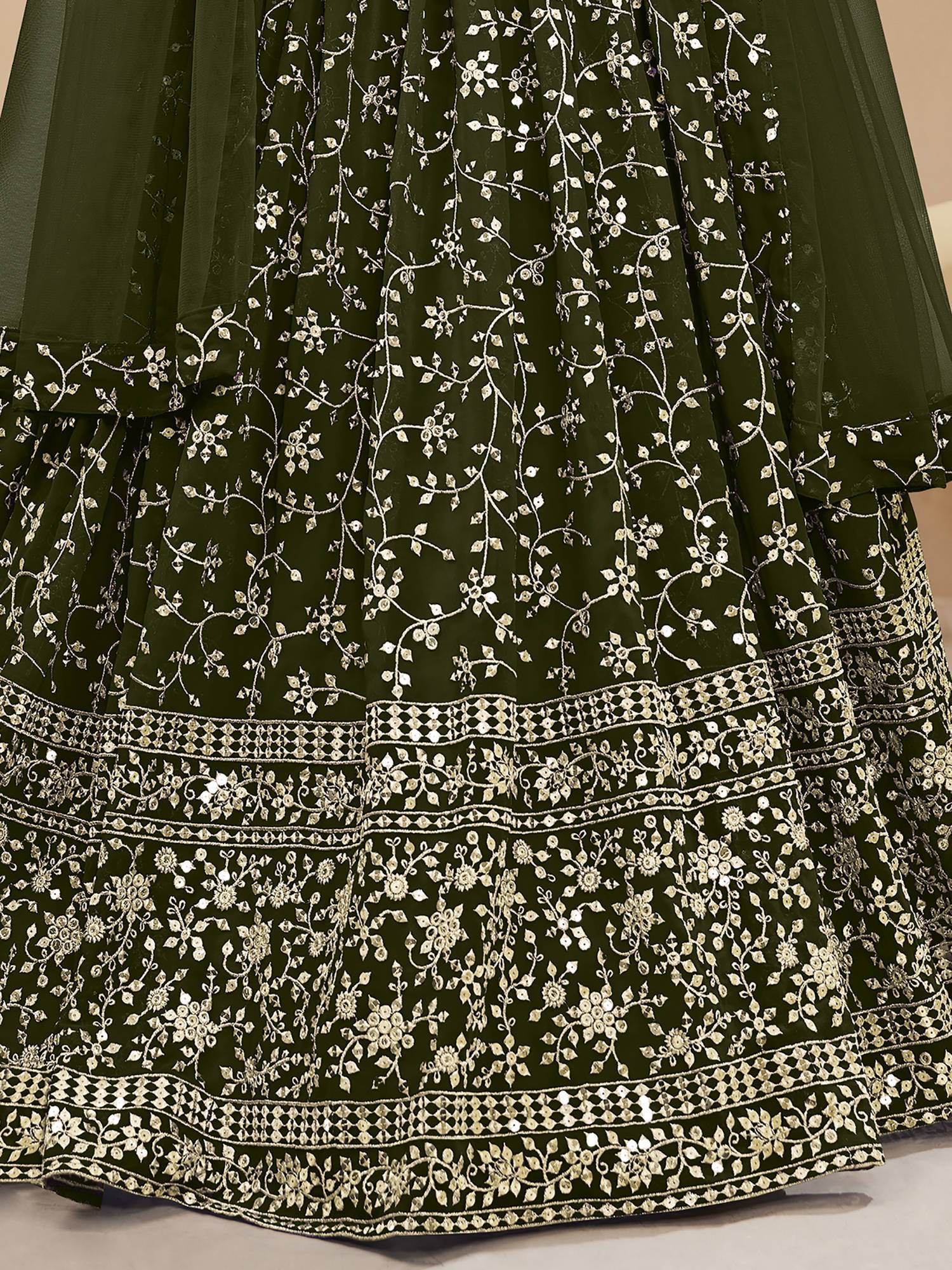 Designed with intricate details and exquisite craftsmanship, this lehenga choli is made from high-quality georgette material. The green color adds a refreshing touch to your ensemble, making you stand out in any crowd. The lehenga features stunning sequin work, zari work, and embroidery work, which adds a touch of glamour and elegance to the overall look.
