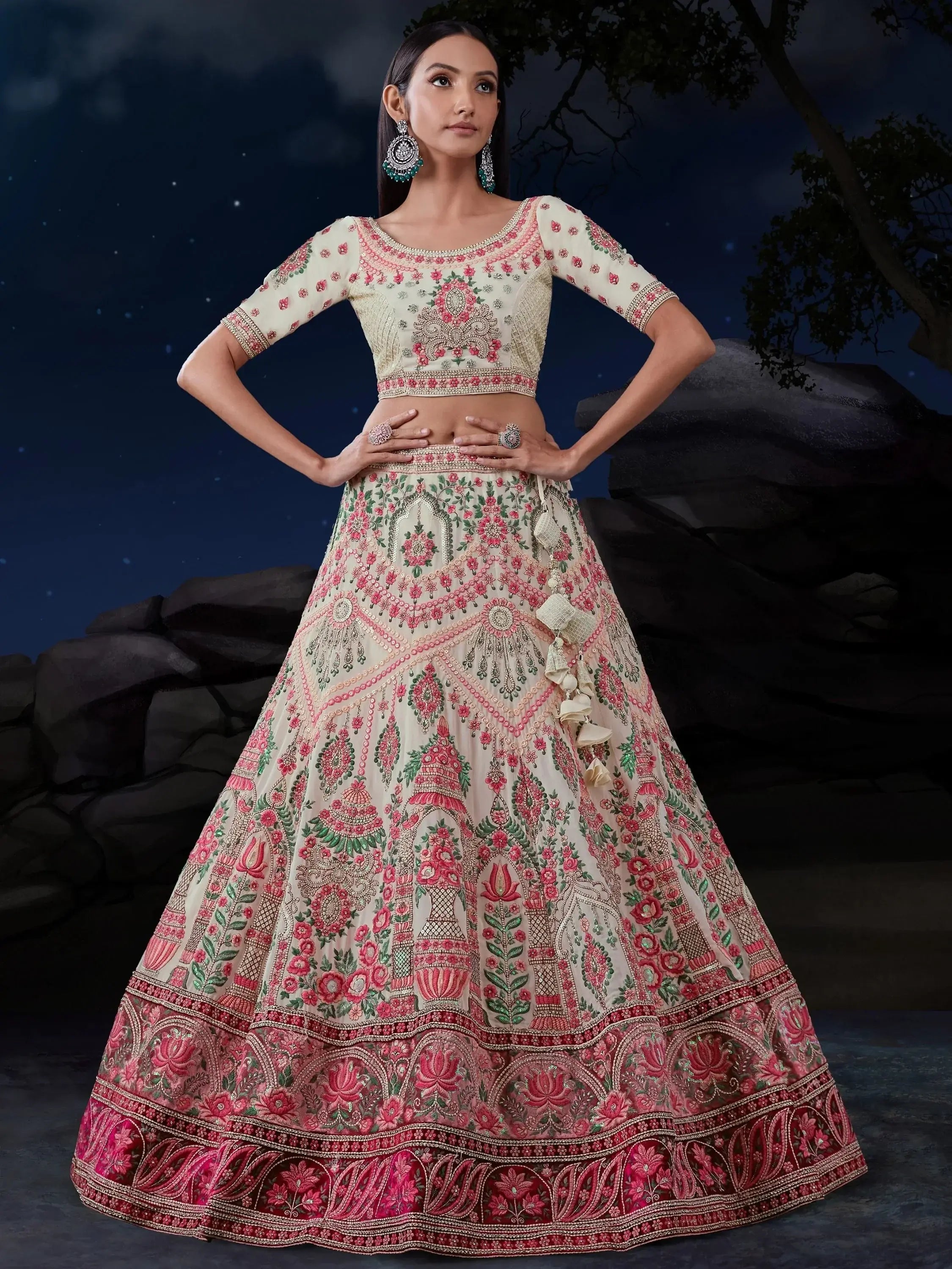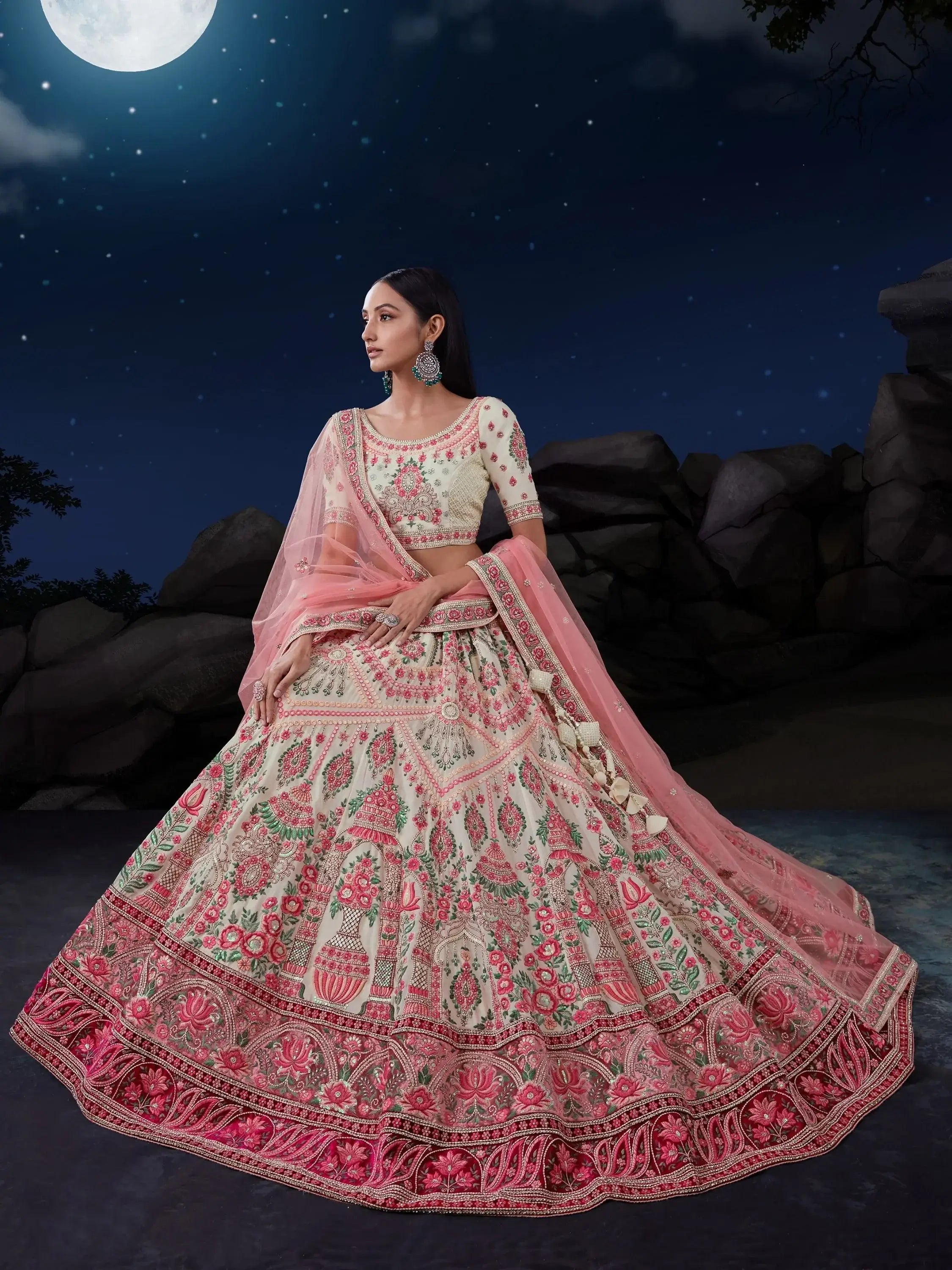 The semi-stitched lehenga is designed to fit up to 42 inches, while the matching net choli comes unstitched for a customizable fit. The pink net dupatta complements the off-white ensemble beautifully, adorned with dori work, zarkan work, thread work, and a sequin lace border. This set is a must-have for anyone looking to make a statement at their next event.