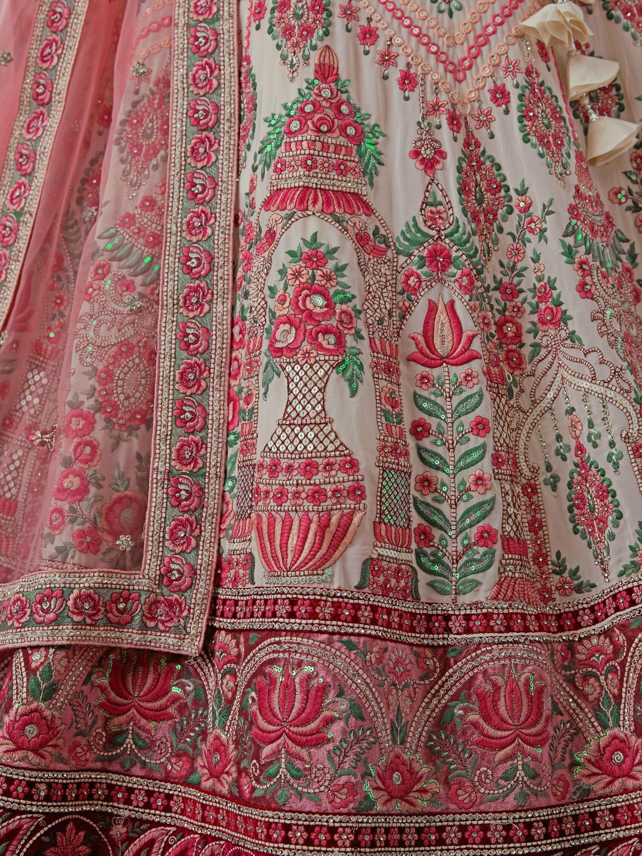 This outfit includes exquisite dori work, sequin embellishments, intricate thread embroidery, detailed zarkan work, and the luxurious georgette fabric that drapes beautifully on the body. Every element of this lehenga choli is carefully crafted to make you feel like a princess on your special day.