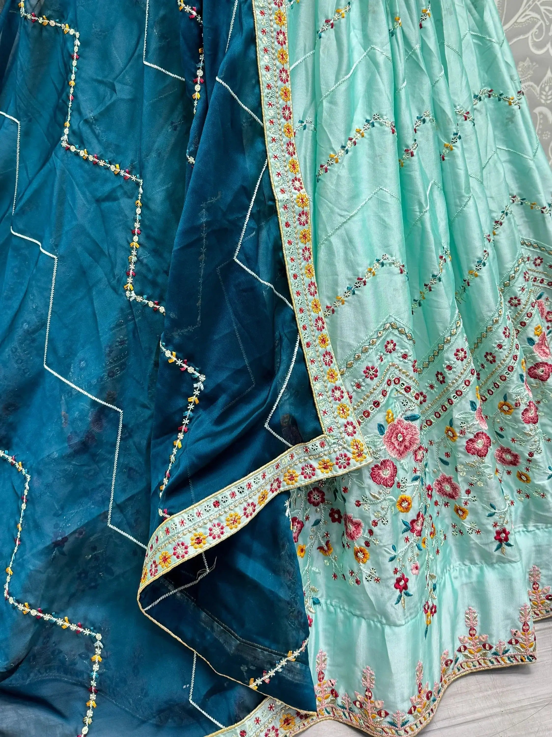 The sky-blue color of this lehenga choli is versatile and flattering for all skin tones, making it a timeless addition to your ethnic wear collection. The intricate thread work, sequin work, and zari work add a touch of opulence, making this outfit perfect for special events and celebrations. Whether you're a bride, bridesmaid, or guest, this lehenga choli set is sure to make a statement wherever you go.