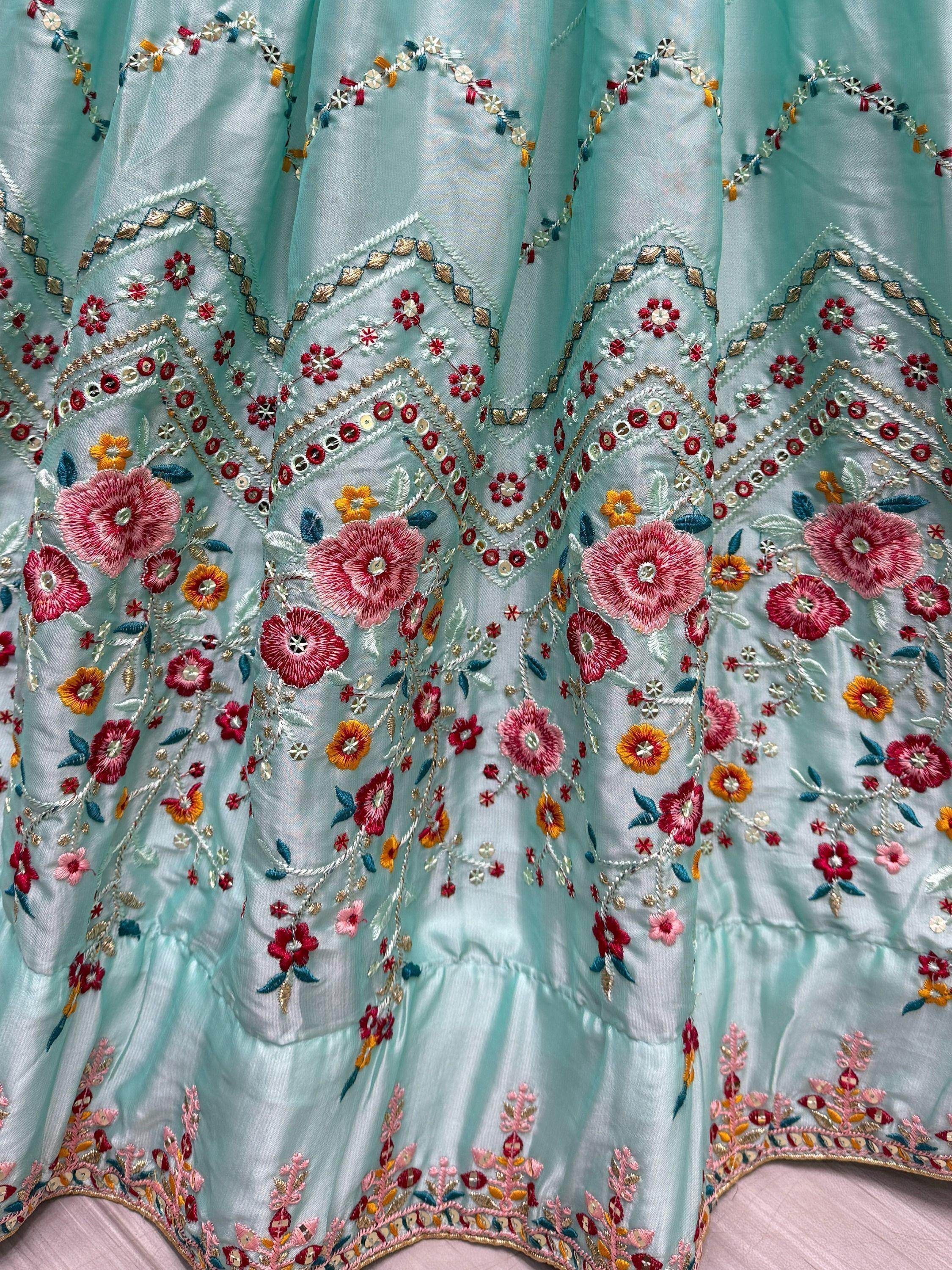 Our "bewitching sky-blue thread-work silk wedding wear lehenga choli" is a must-have for anyone looking to make a style statement at weddings, receptions, and other special occasions. With its luxurious silk fabric, intricate embellishments, and flattering design, this set is sure to turn heads and make you feel like a queen.