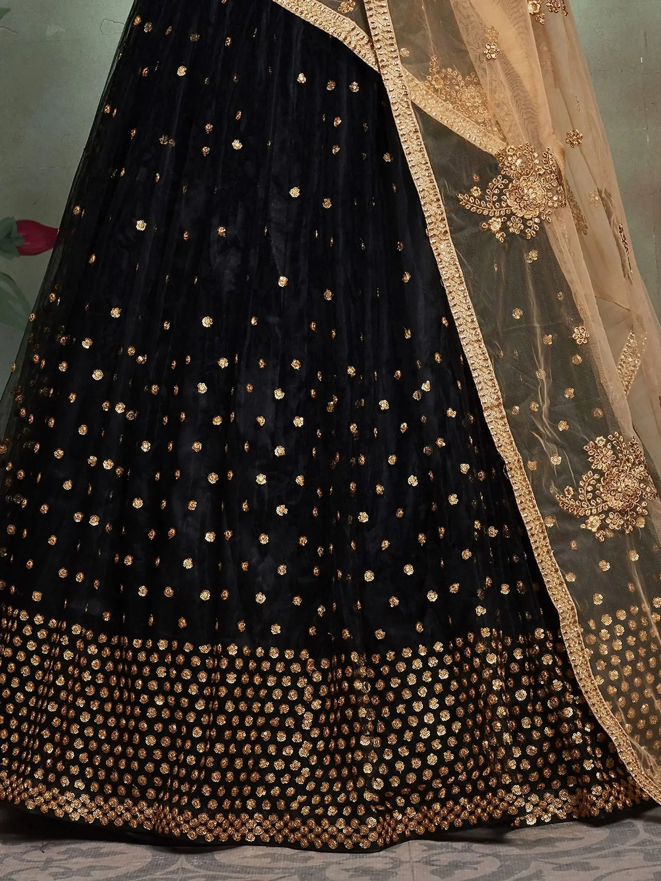 Crafted with care in India, this bridal lehenga is made using high-quality net fabric and features sequins and zari work, making it a true work of art. The flawless combination of black and golden colors adds a touch of sophistication, while the net fabric enhances the overall appeal.