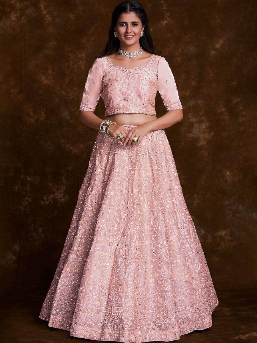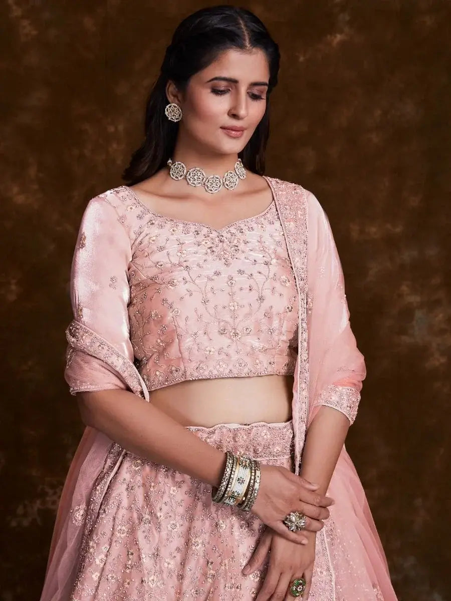 Look stunning at your next festive occasion with our semi-stitched peach lehenga choli. This exquisite ensemble features a beautiful peach color that is elegantly combined with intricate dori, thread, flower embroidery, and zarkan work. With its eye-catching design, this lehenga choli is sure to turn heads at any gathering.
