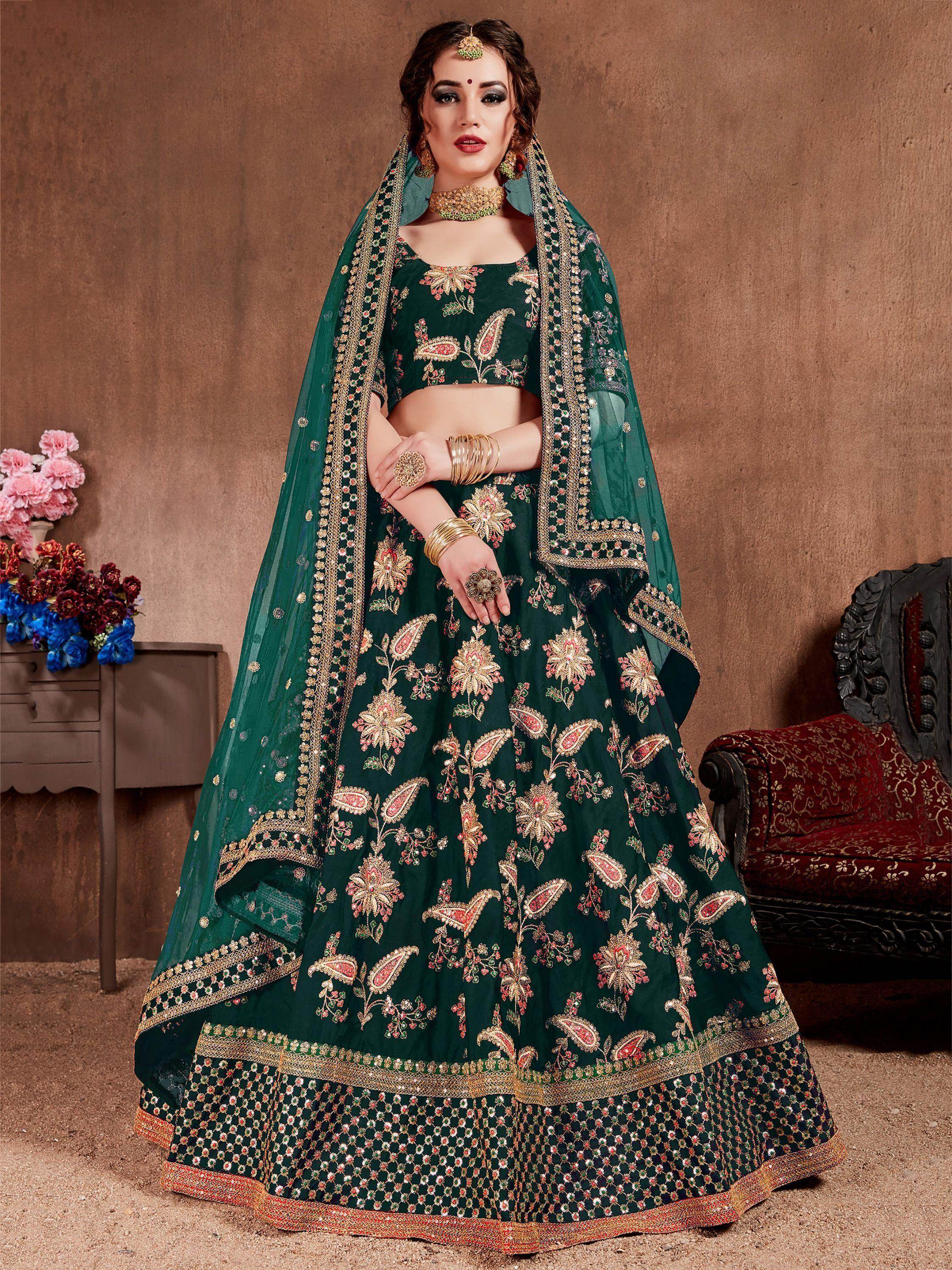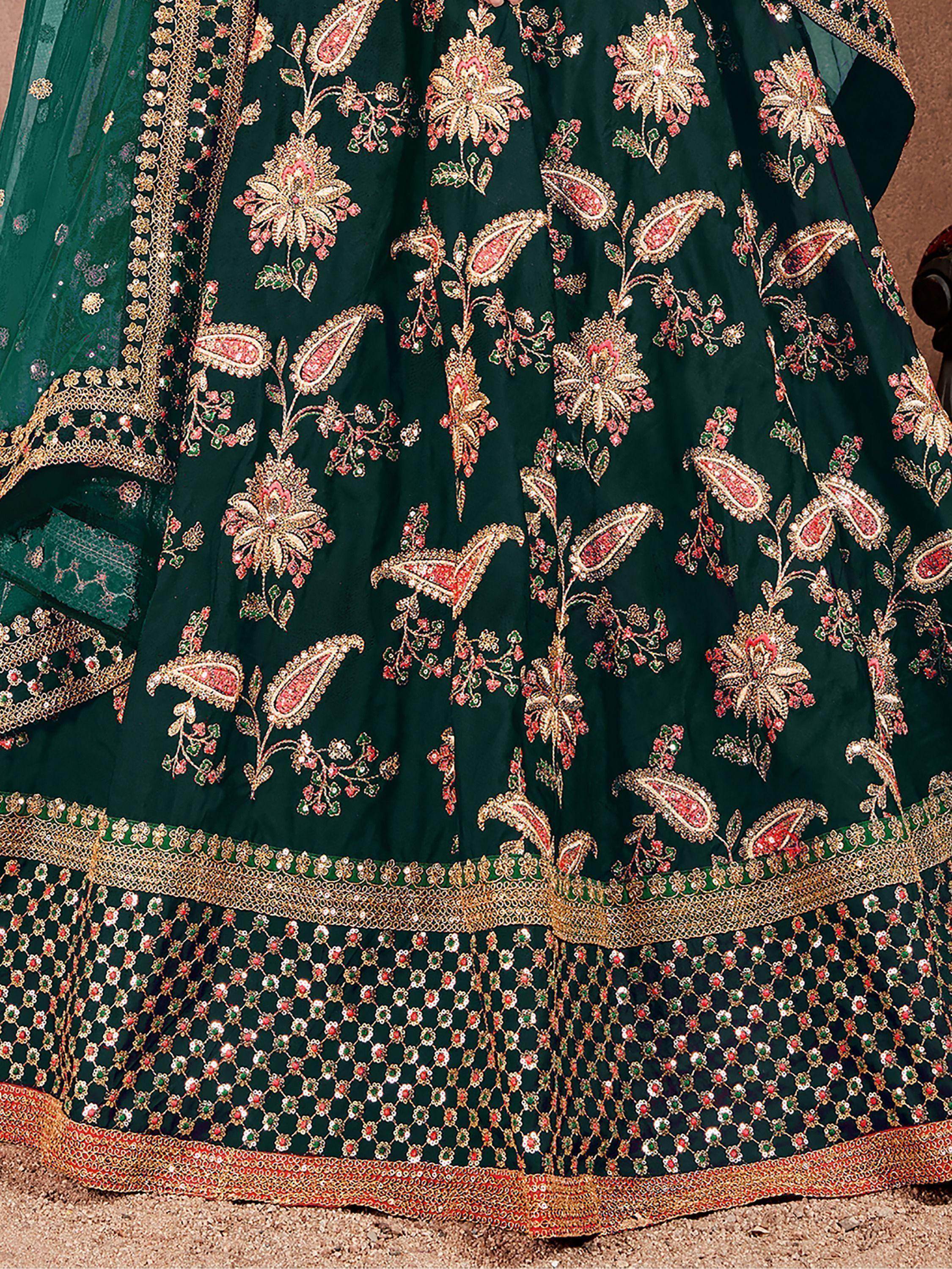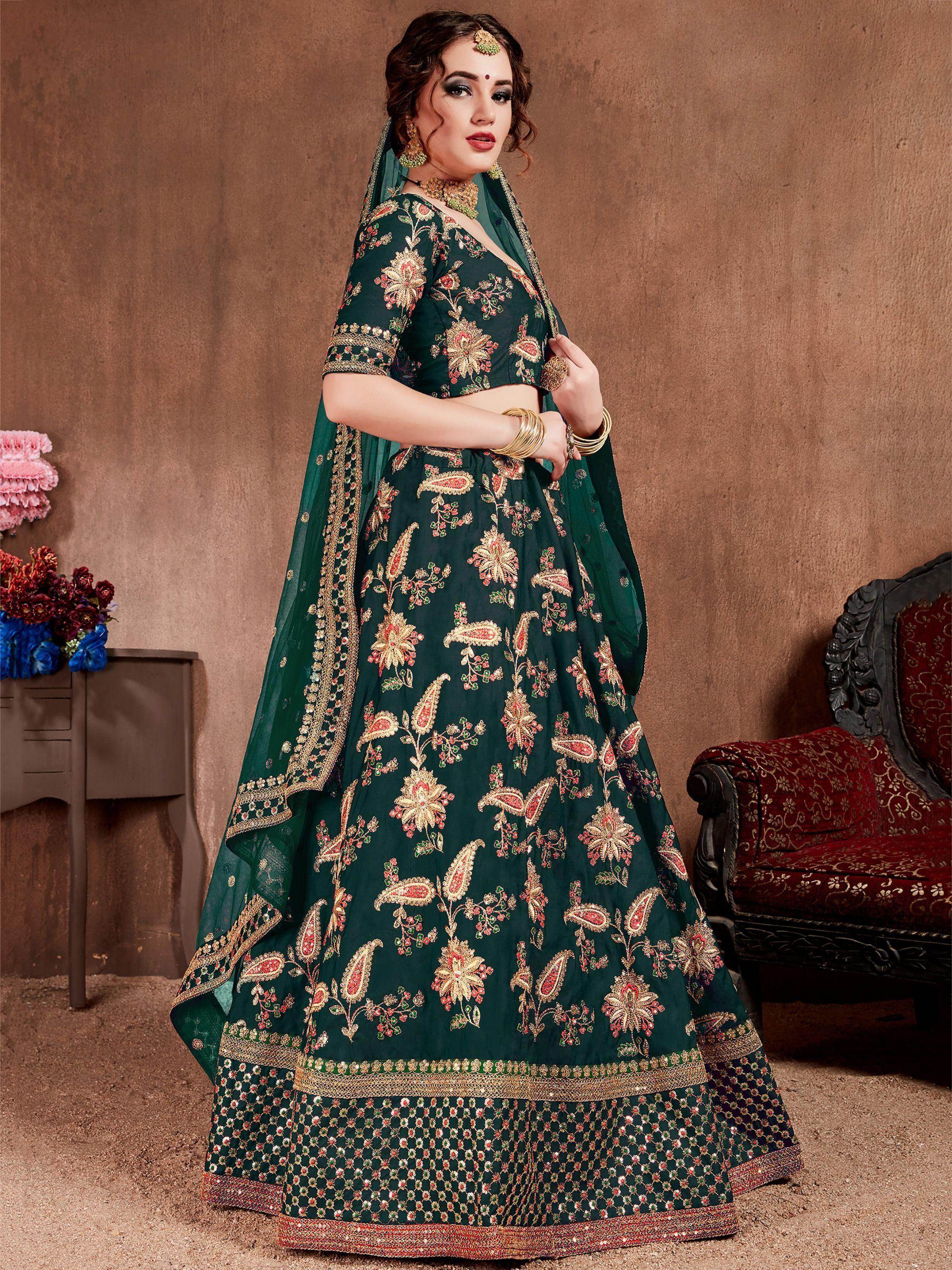 Made from high-quality taffeta silk material, the lehenga features a beautiful bottle green color, giving you an elegant and regal look. The dori work, sequin work, and multi-thread embroidery work add a touch of glamour, making you the center of attention wherever you go.