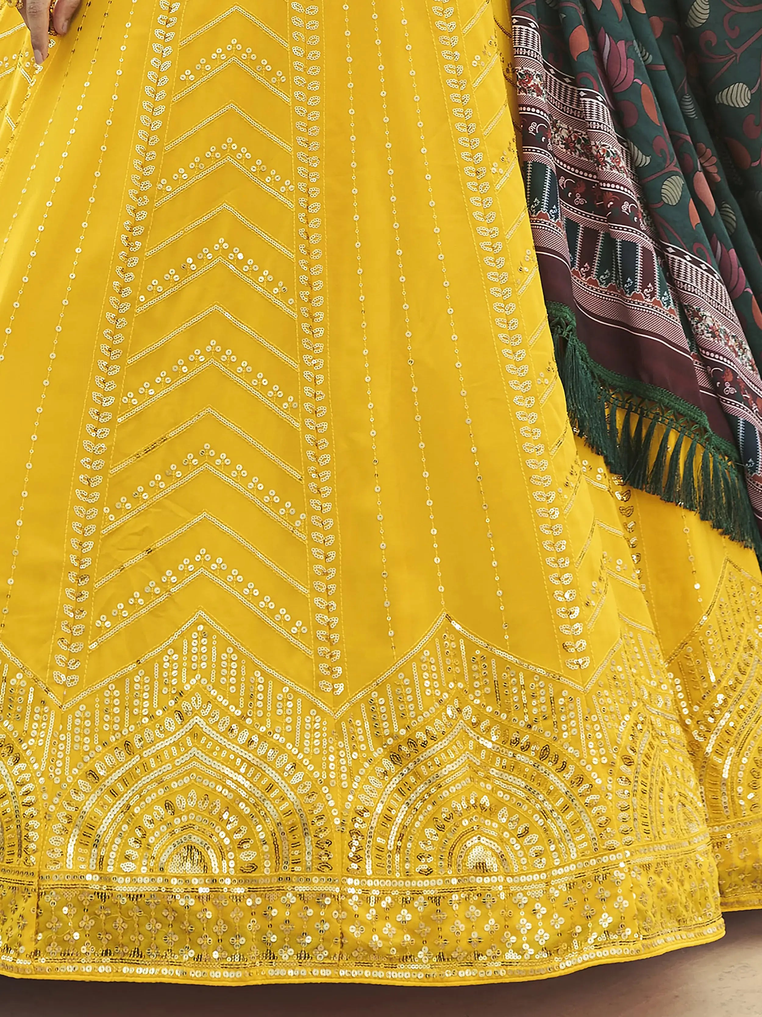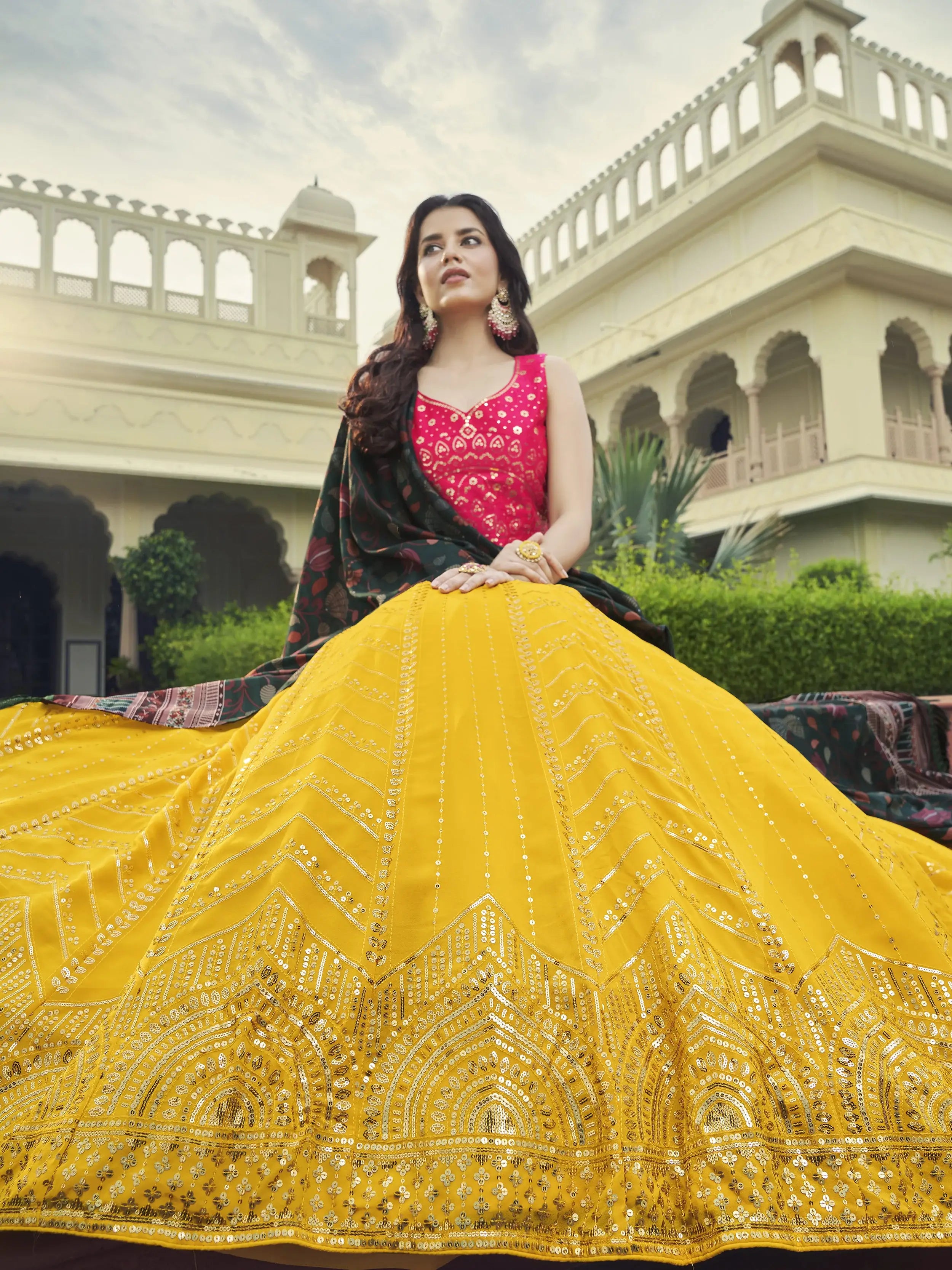 Keep your glam quotient high and leave everyone awestruck with this auspicious yellow color designer lehenga made of georgette material embellished with floral sequins embroidered work all over.