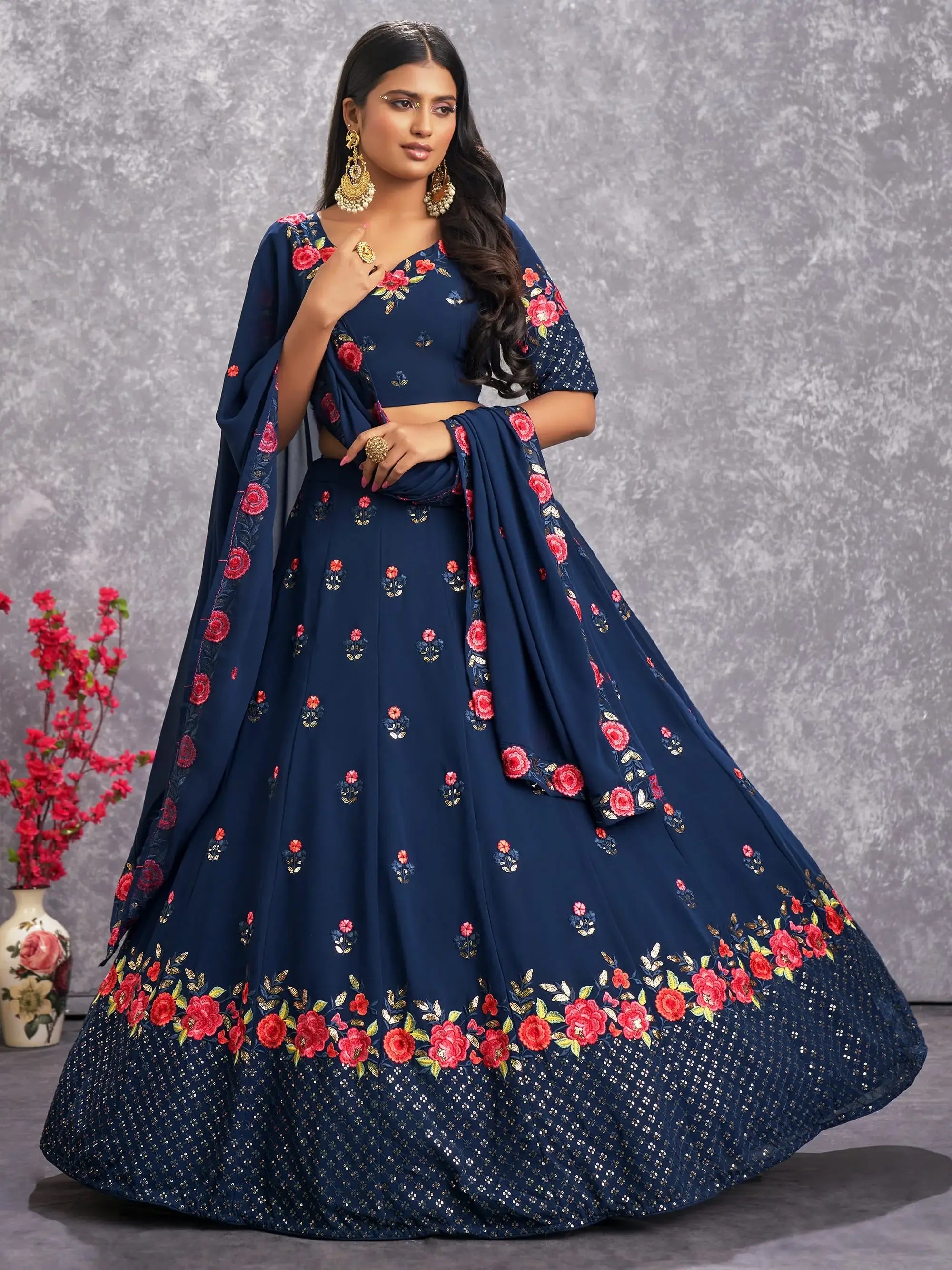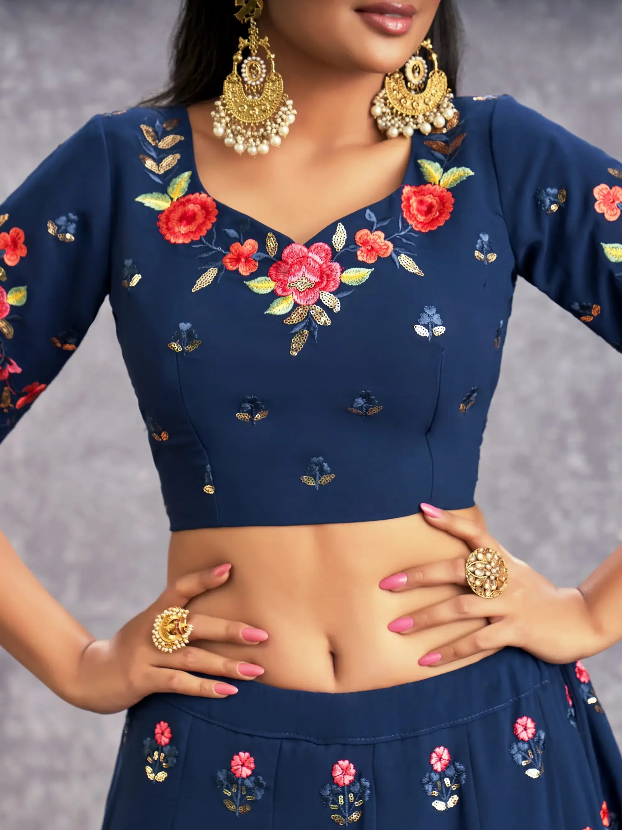 Create your occasional look more impressive by enrobing this stunning blue color lehenga formed with georgette material performed with thread embroidery and sequin work.