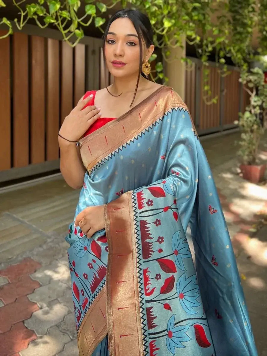Show off your traditional Indian beauty with our gorgeously woven sky blue banarasi paithani silk saree and blouse. This captivating pair is a true classic, meticulously woven with resham zari to create an exquisite work of art. The saree fabric is made from pure banarasi paithani silk, offering a perfect blend of luxury and culture.