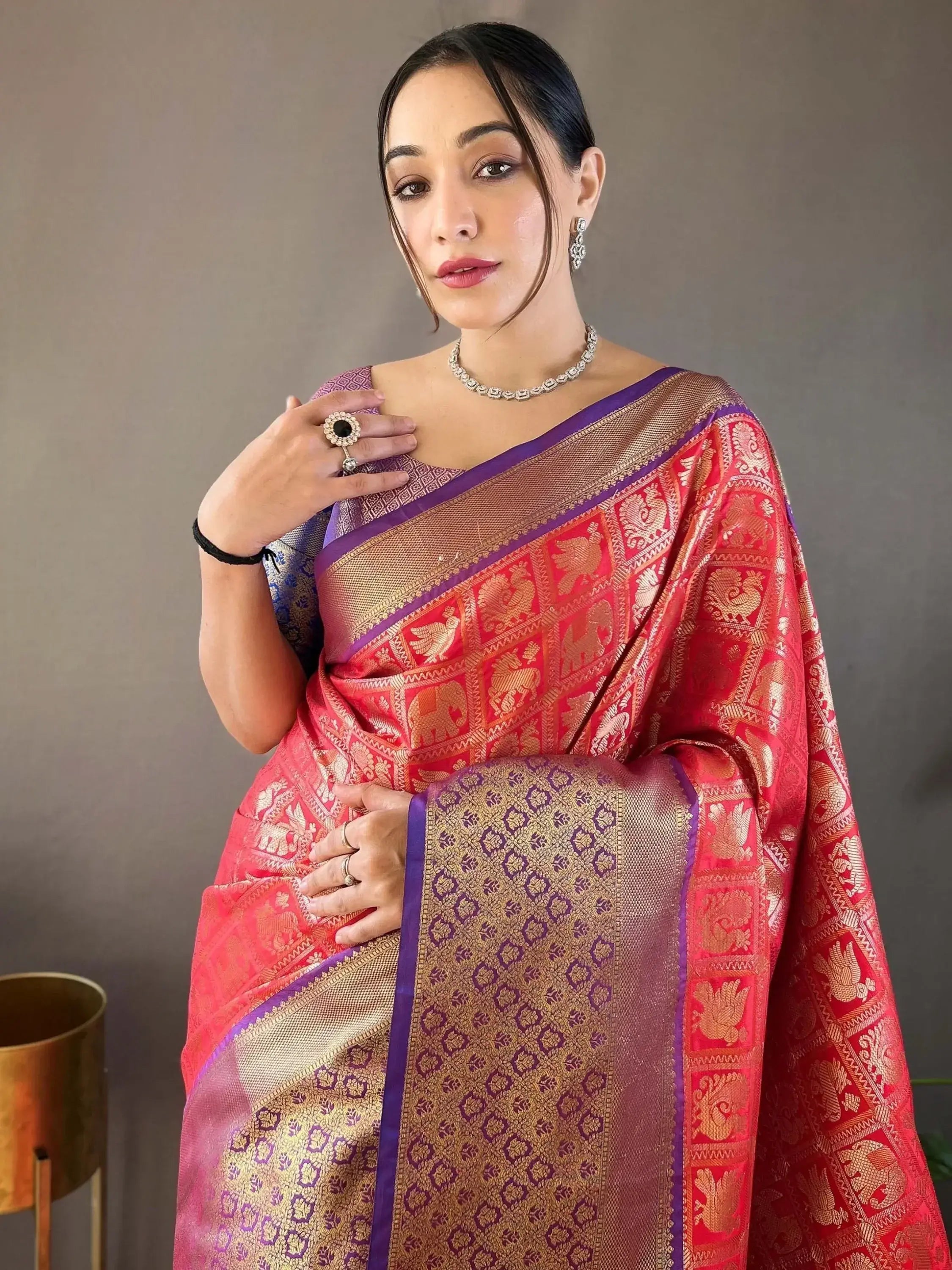 This saree include a vibrant coral red color that is bound to turn heads, a matching purple color silk blouse with zari weaving work, and a generous length of 5.50 meters for the saree and unstitched material for the blouse. The zari weaving work adds a traditional touch to the outfit, making it a versatile option for various occasions.