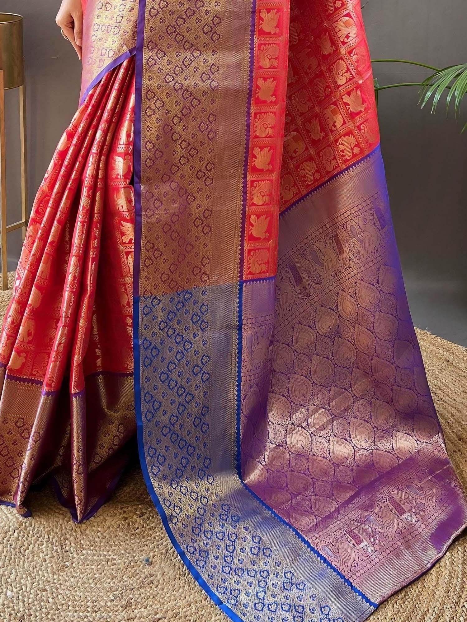 Our captivating coral red zari weaving silk wedding saree with blouse is a must-have addition to your ethnic collection. With its exquisite craftsmanship, vibrant color, and timeless appeal, this saree is sure to become a favorite for any special occasion. Shop now and add this statement piece to your wardrobe.