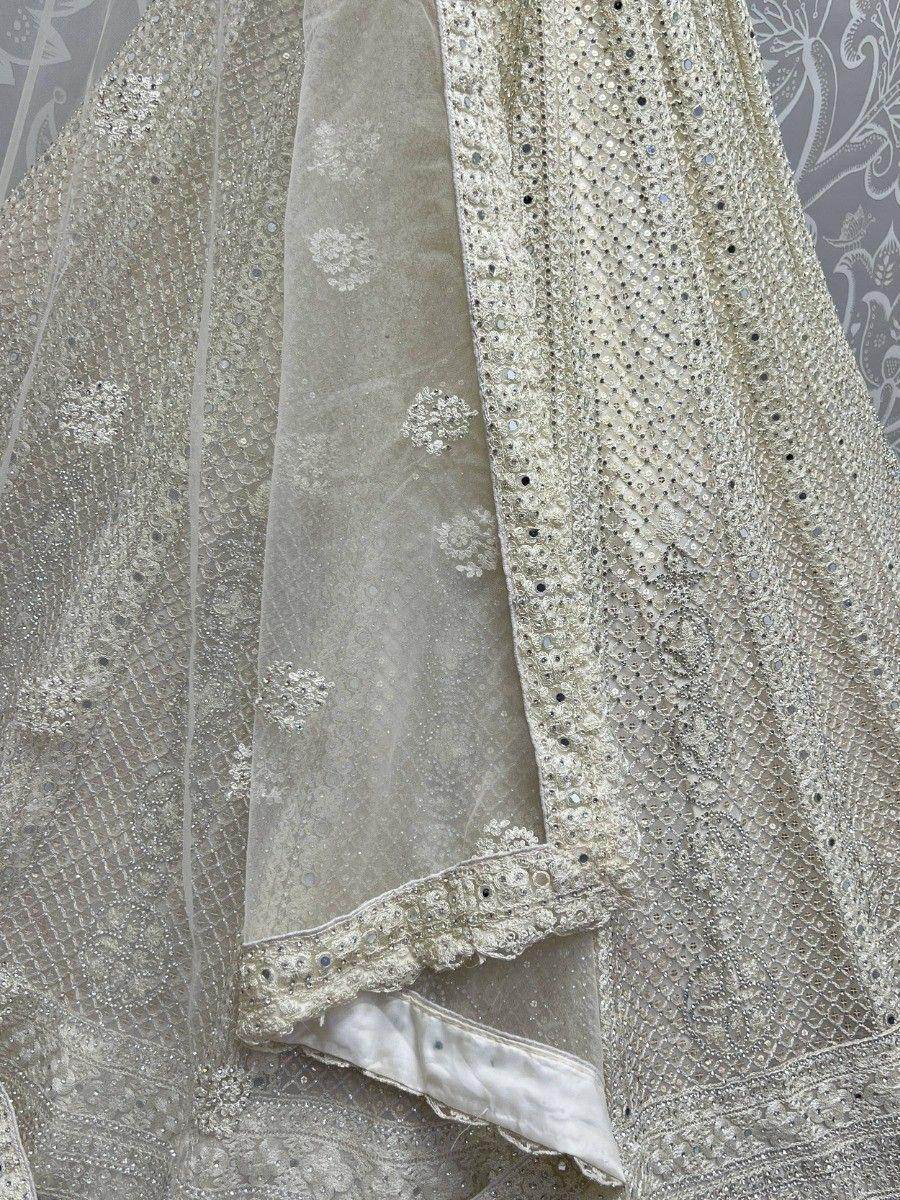 Introducing our captivating cream thread work net reception wear lehenga choli, a stunning ensemble designed to make you stand out at any special occasion. Made from high-quality cream net material, this lehenga features intricate fancy embroidered work, dori work, multi-thread work, and sparkling diamond work, creating a mesmerizing and glamorous look.