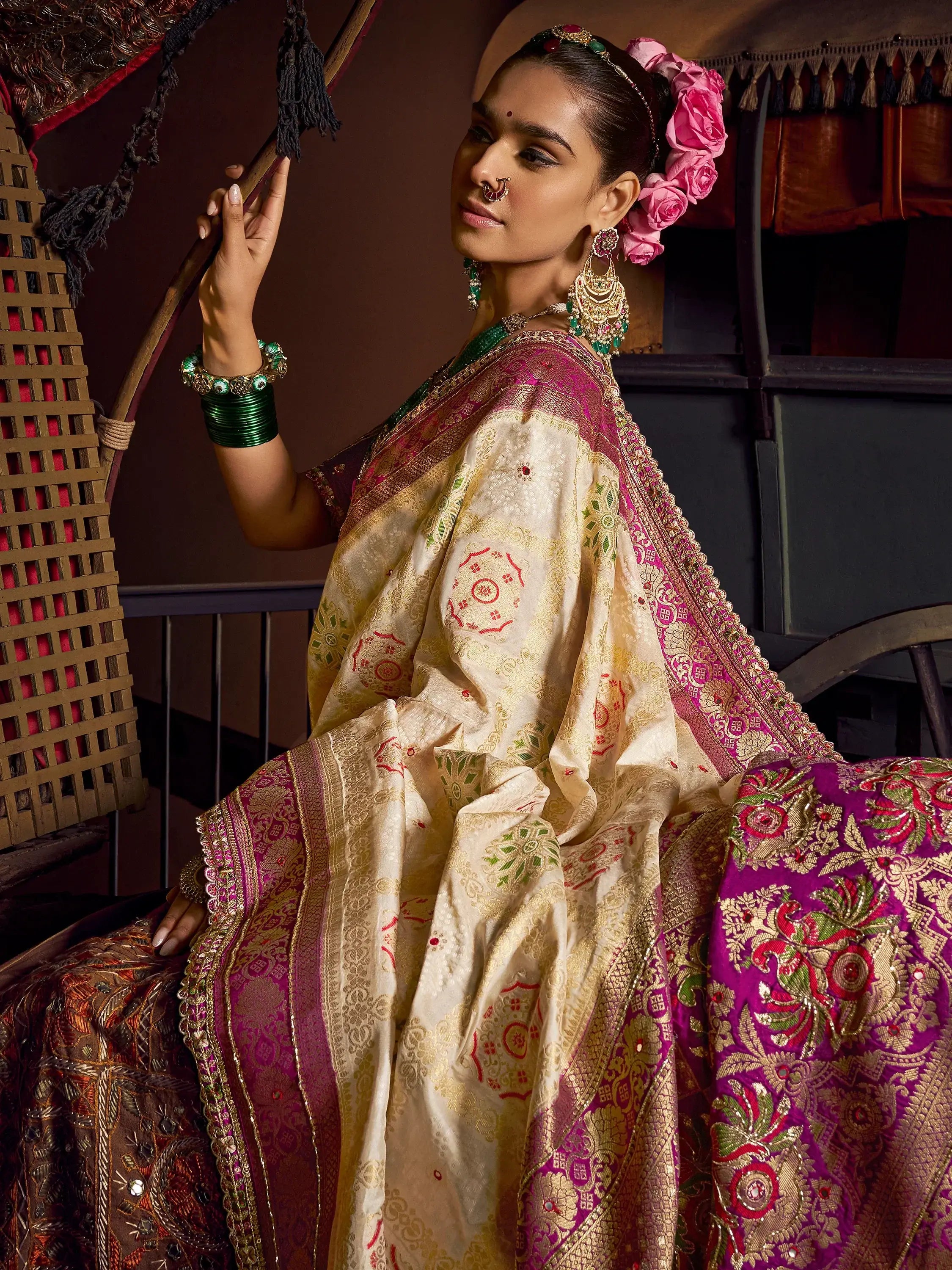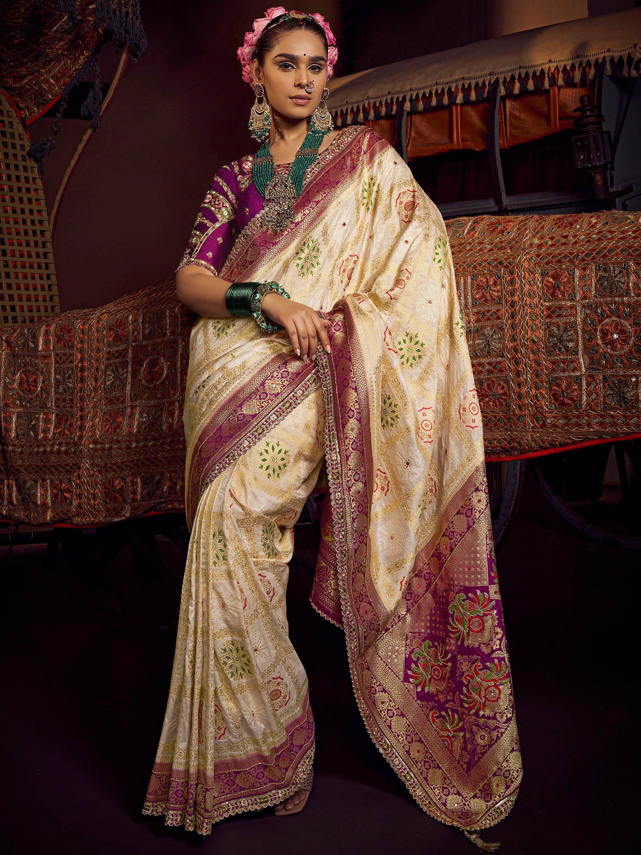 This elegant cream-colored dola silk saree is intricately designed with stunning zari weaving work, thread embroidered work, sequins, and mirror work, making it a perfect choice for weddings and festivals. The saree comes with a beautiful purple silk blouse adorned with delicate thread embroidery and sequin work to complement the overall look.