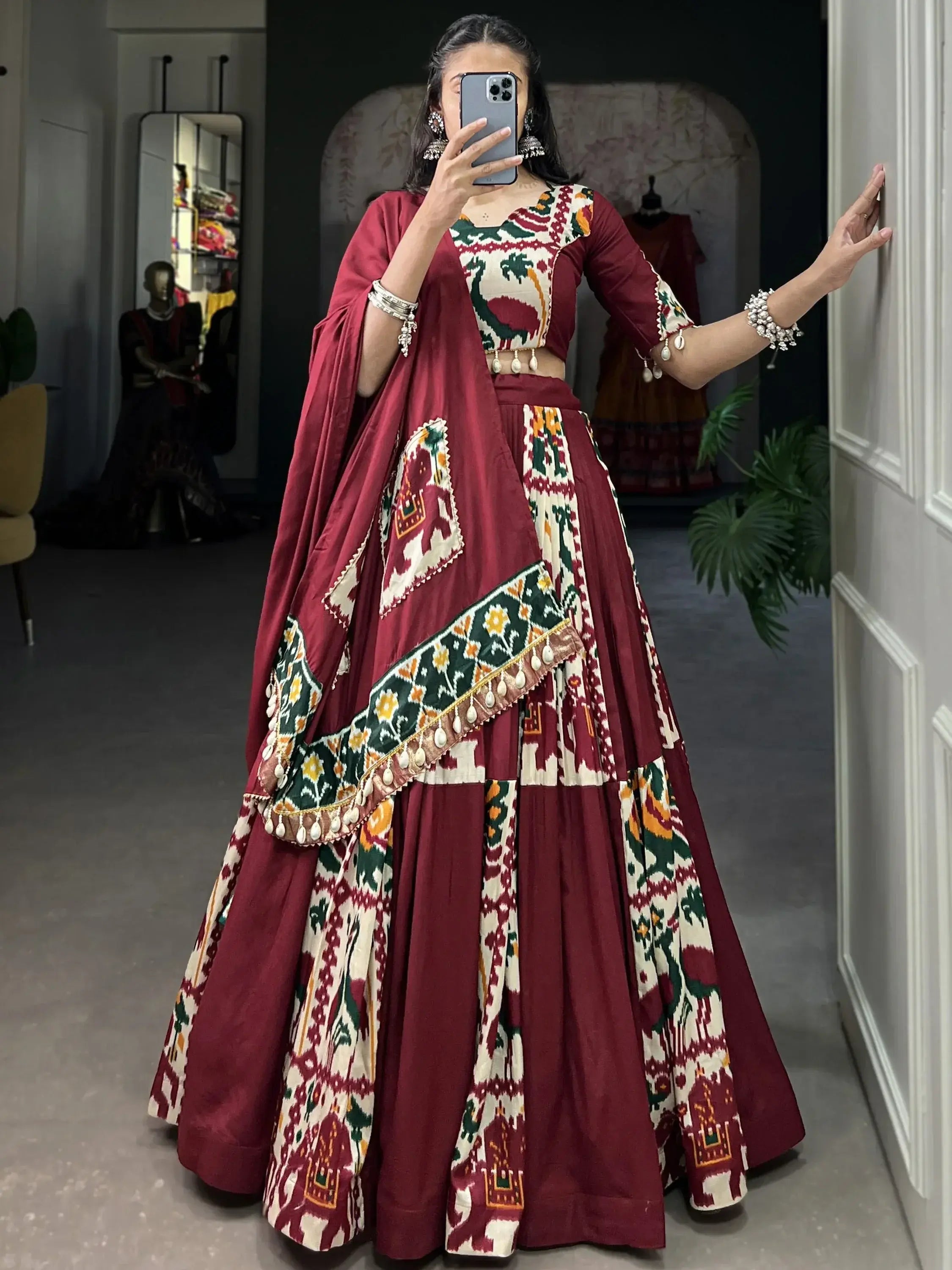 Don't miss out on the opportunity to add this "captivating maroon digital printed silk patola lehenga choli" to your collection. Order now and experience the unparalleled beauty and elegance of this timeless ensemble.
