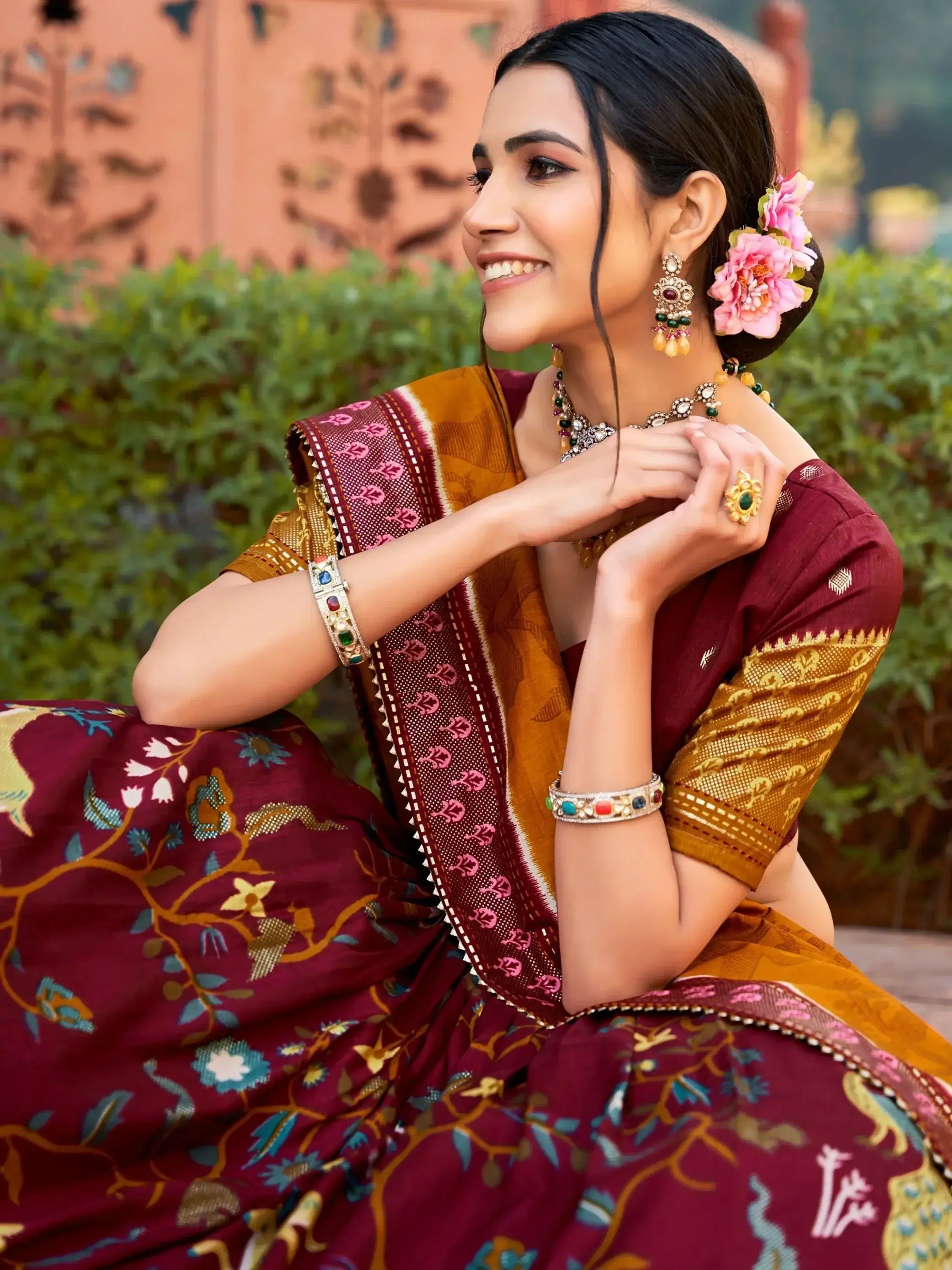 Upgrade your ethnic wardrobe with this captivating maroon printed silk festival wear lehenga choli with a dupatta. Crafted with exquisite detail and high-quality materials, this stunning ensemble is perfect for weddings and festivals.