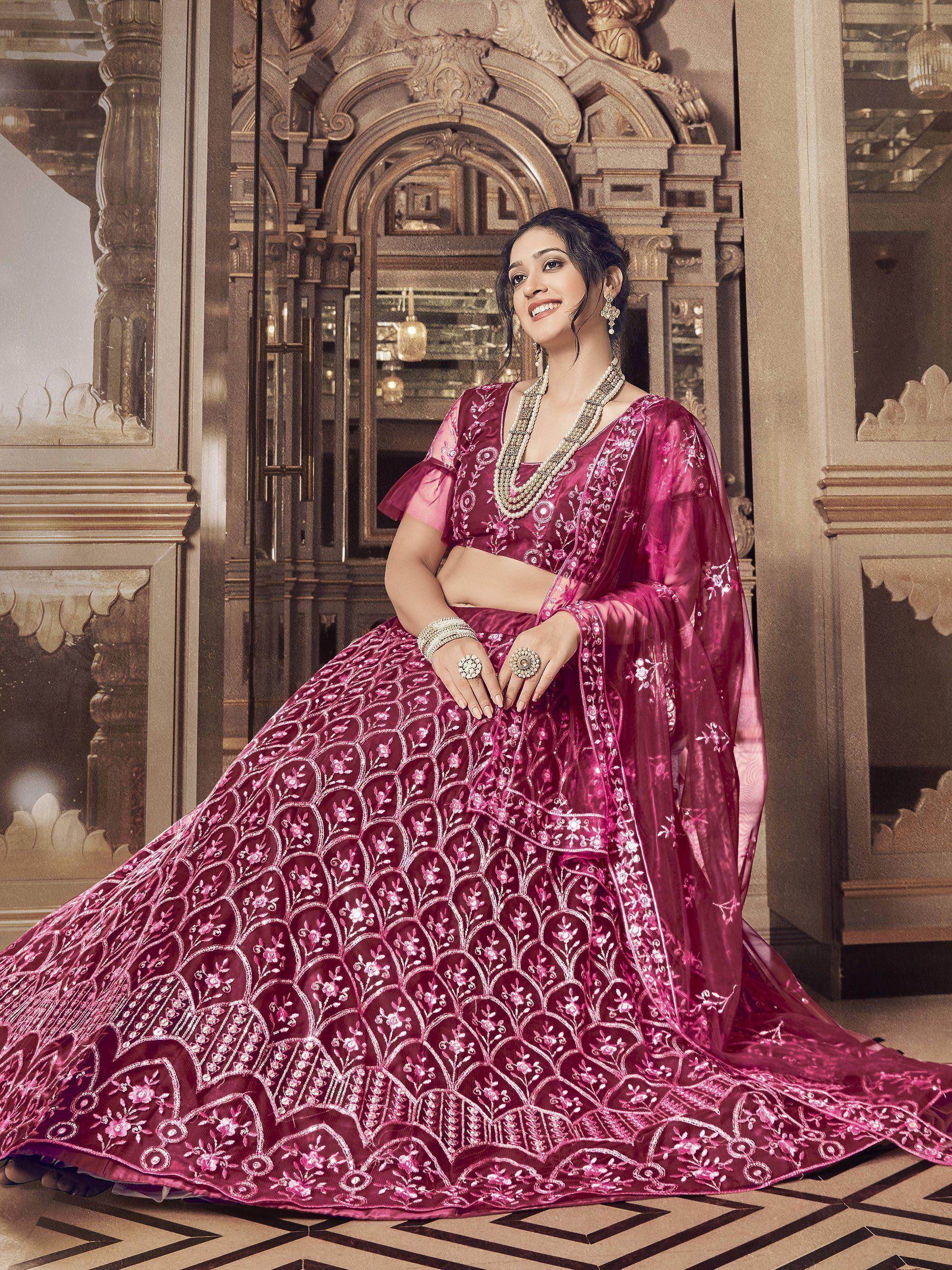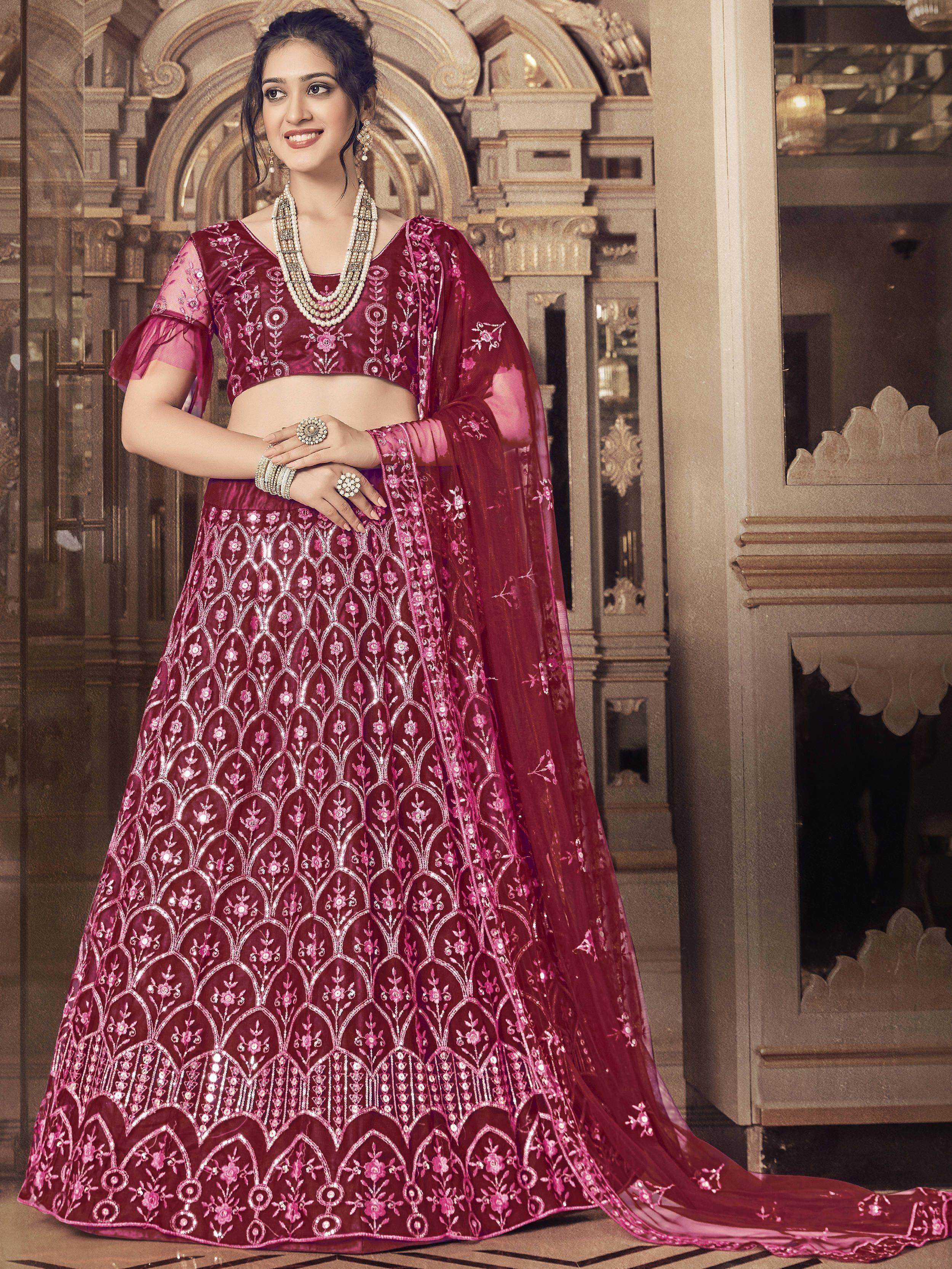 Create your occasional look more impressive enrobing this stunning maroon color lehenga choli made of soft net material embellished with thread and sequence work.
