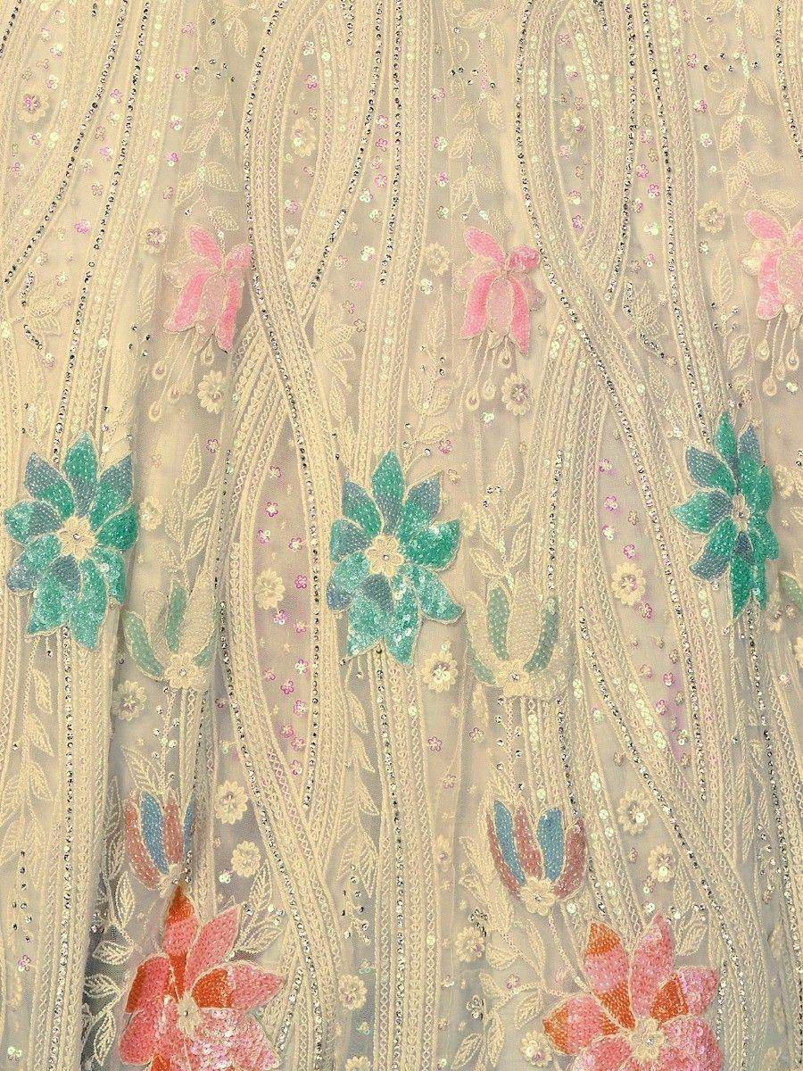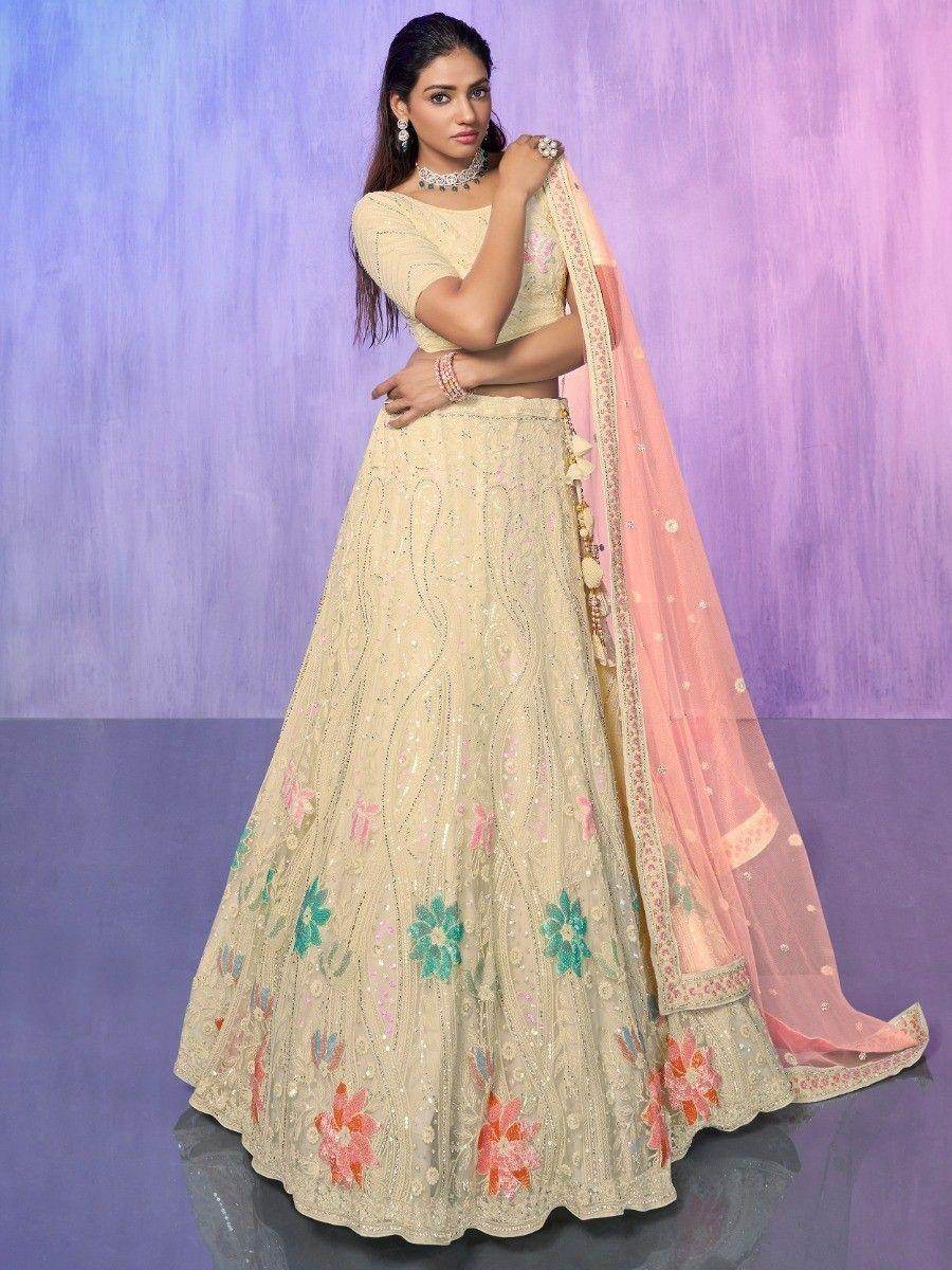 Add a touch of elegance and grace to your ethnic wardrobe with our captivating off-white sequins net lehenga choli with dupatta. This exquisite ensemble is meticulously crafted with intricate sequin and embroidered work, showcasing the richness of Indian craftsmanship.