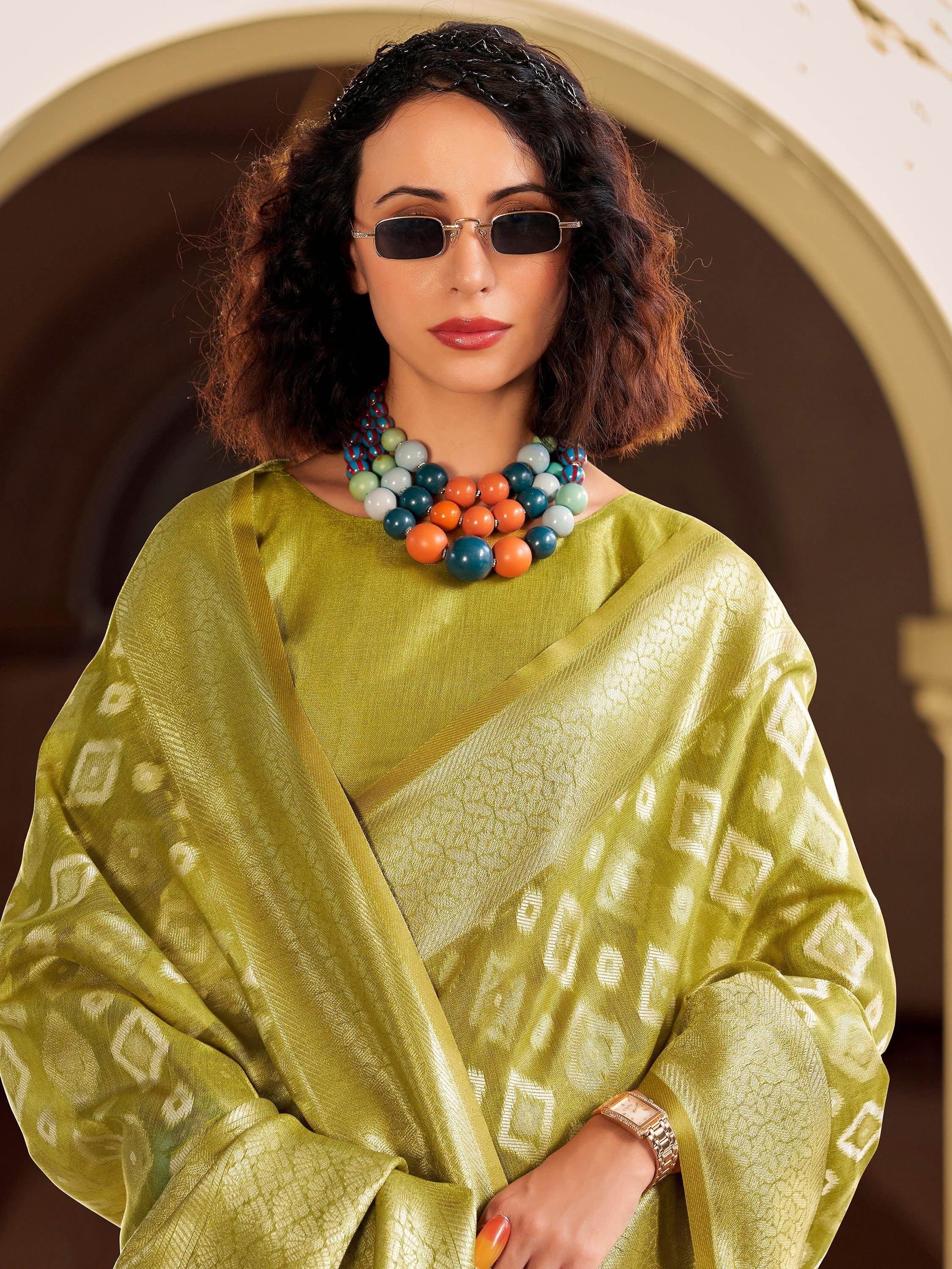 Memorialize your upcoming festivals, events, and occasions with this captivating olive green zari weaving silk festival wear saree. This stunning saree is designed to give you the perfect ethnic look, making you stand out in any crowd.