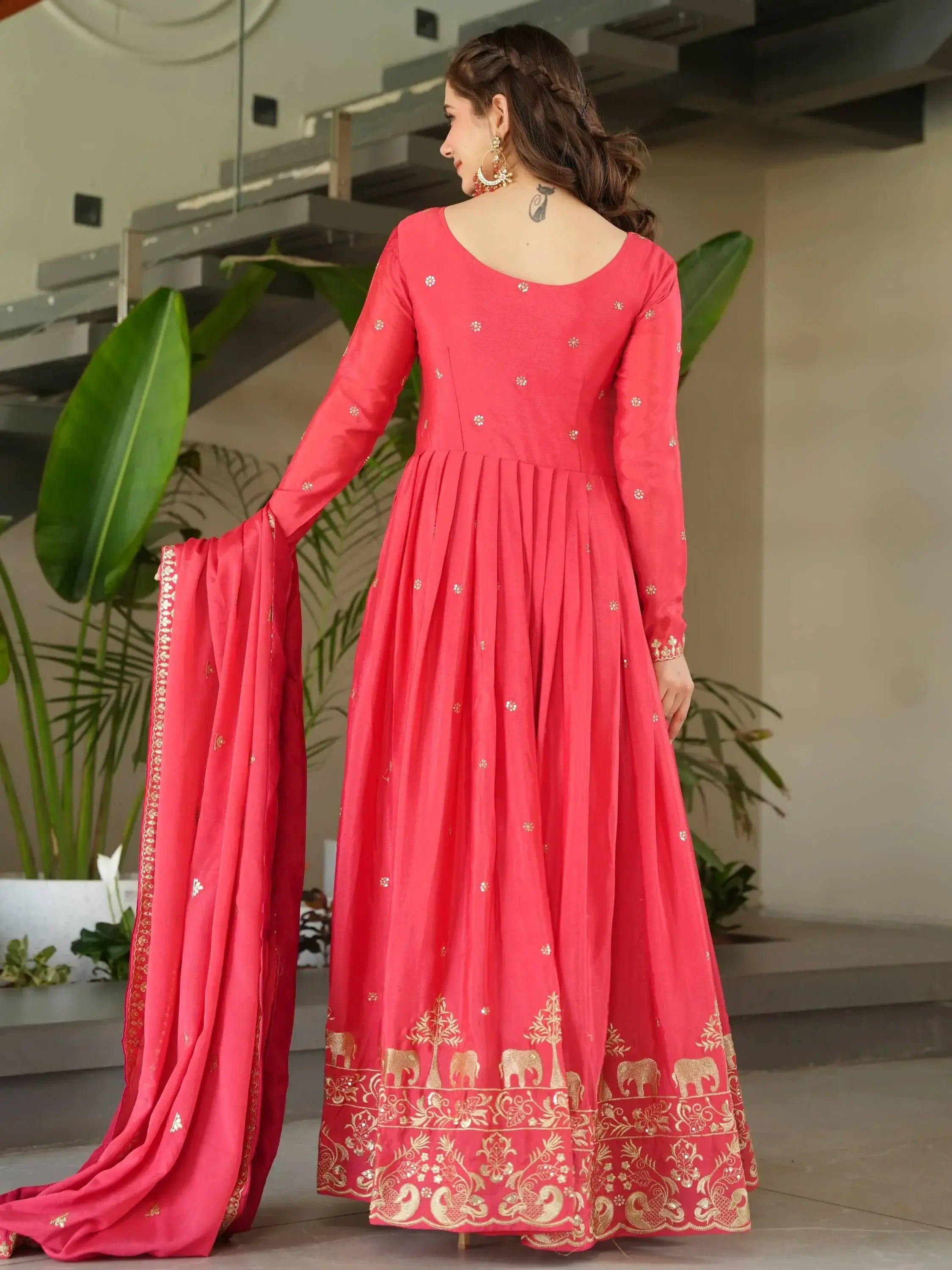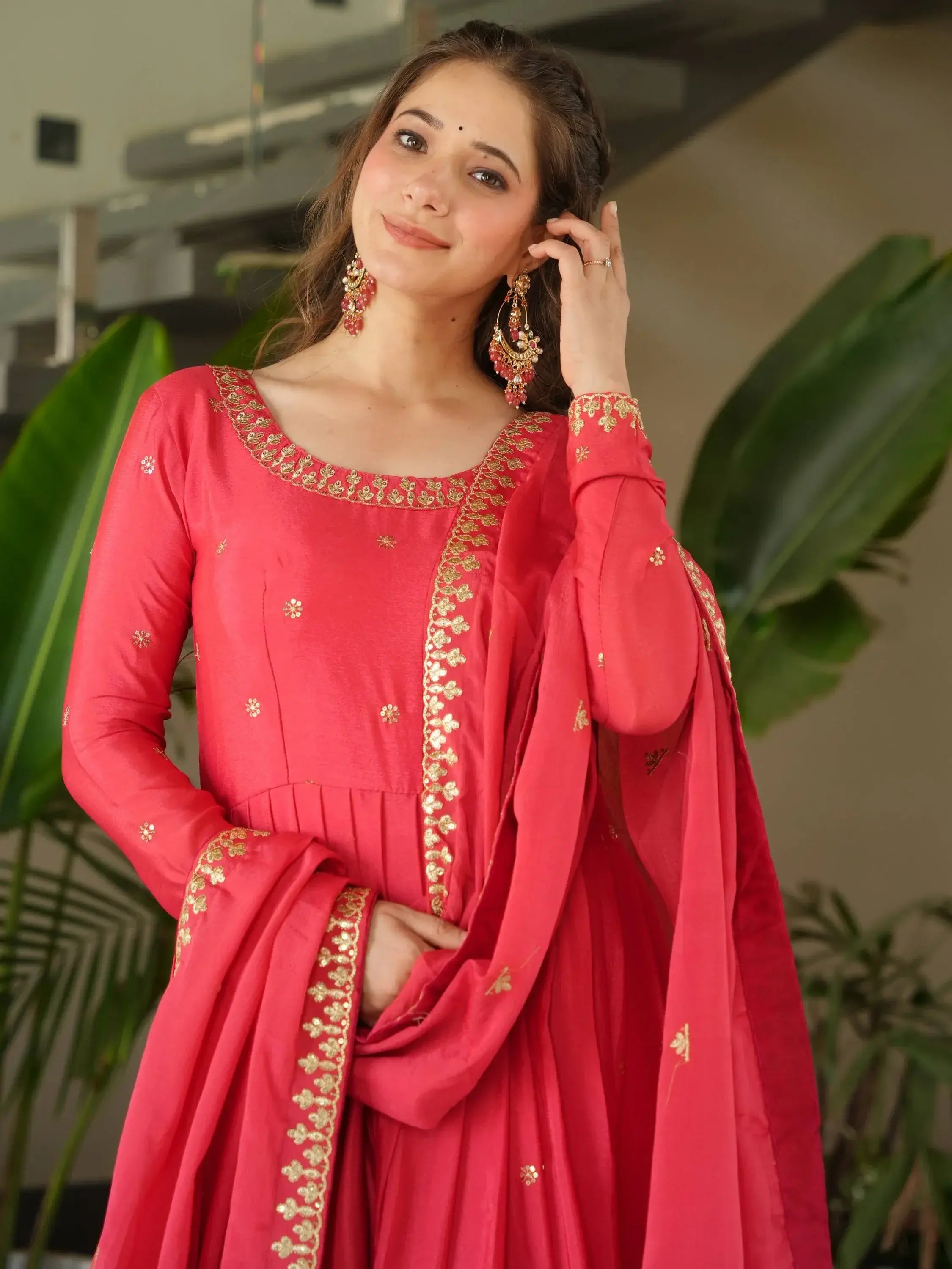 Make a graceful impression at any event with our captivating peach Chinon gown, designed with intricate sequins and zari work. The soft, flowing Chinon fabric paired with the gentle shimmer of embellishments creates an elegant look perfect for special occasions.