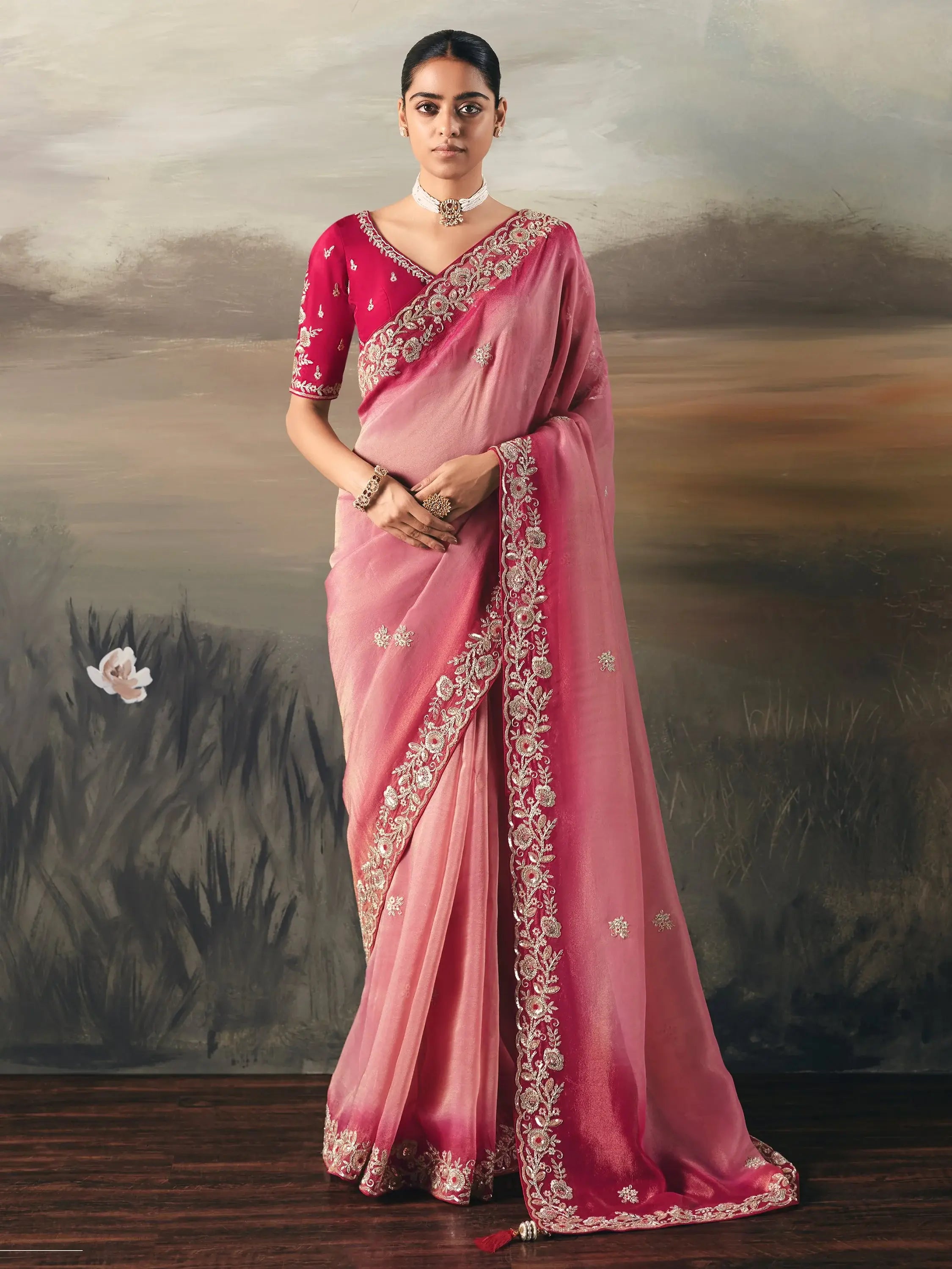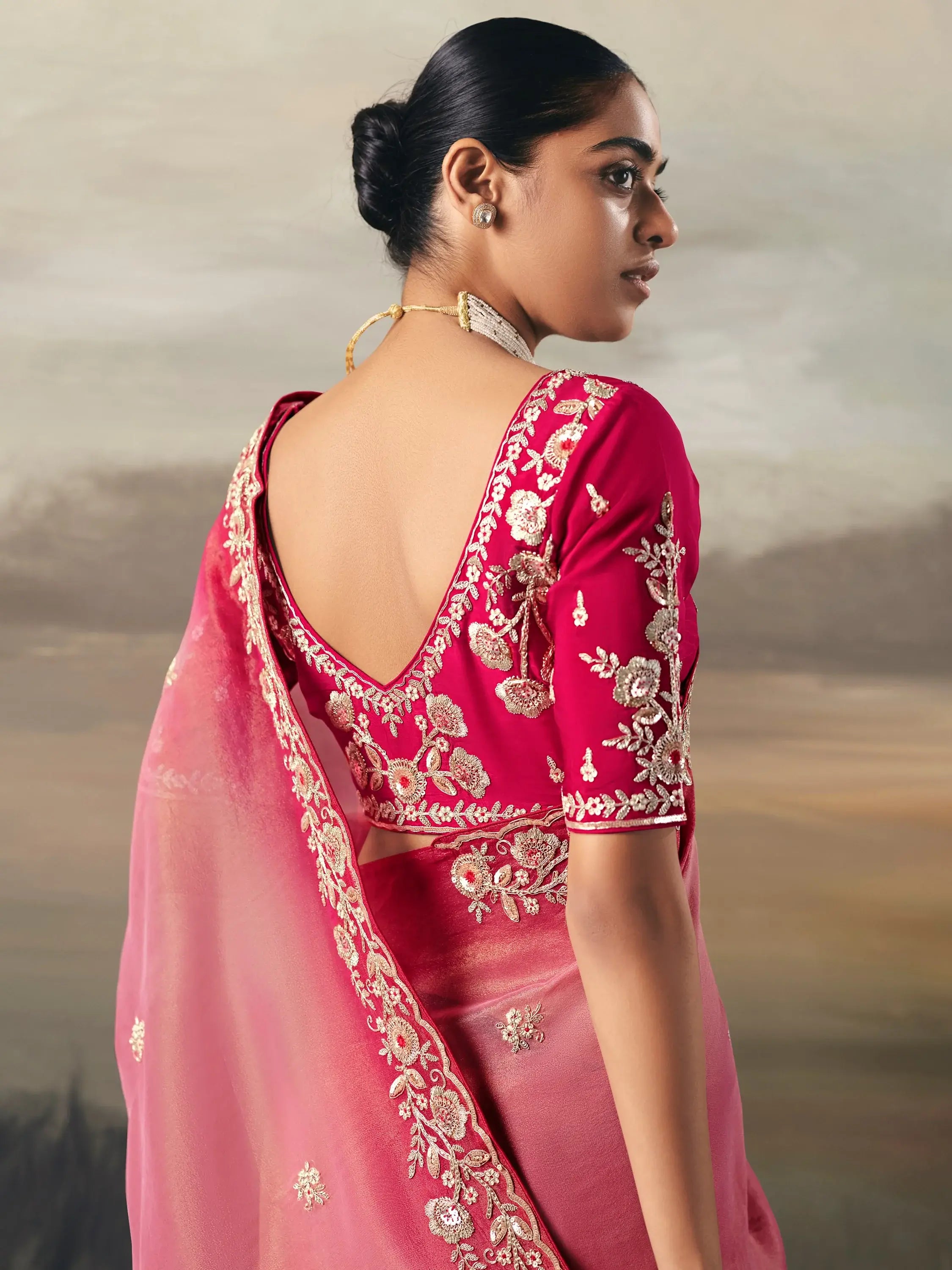 The V-neck blouse in deep pink enhances the overall look with heavy embroidered sleeves. Its premium craftsmanship perfectly complements the saree for a complete party-wear style.