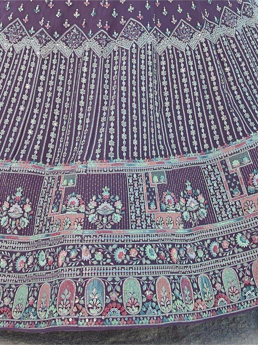 The set includes a matching choli with sequin work and thread embroidery, along with a georgette dupatta that features sequin work and a beautiful lace border. The purple color of this ensemble is rich and vibrant, making it perfect for weddings, receptions, engagements, and any special event.