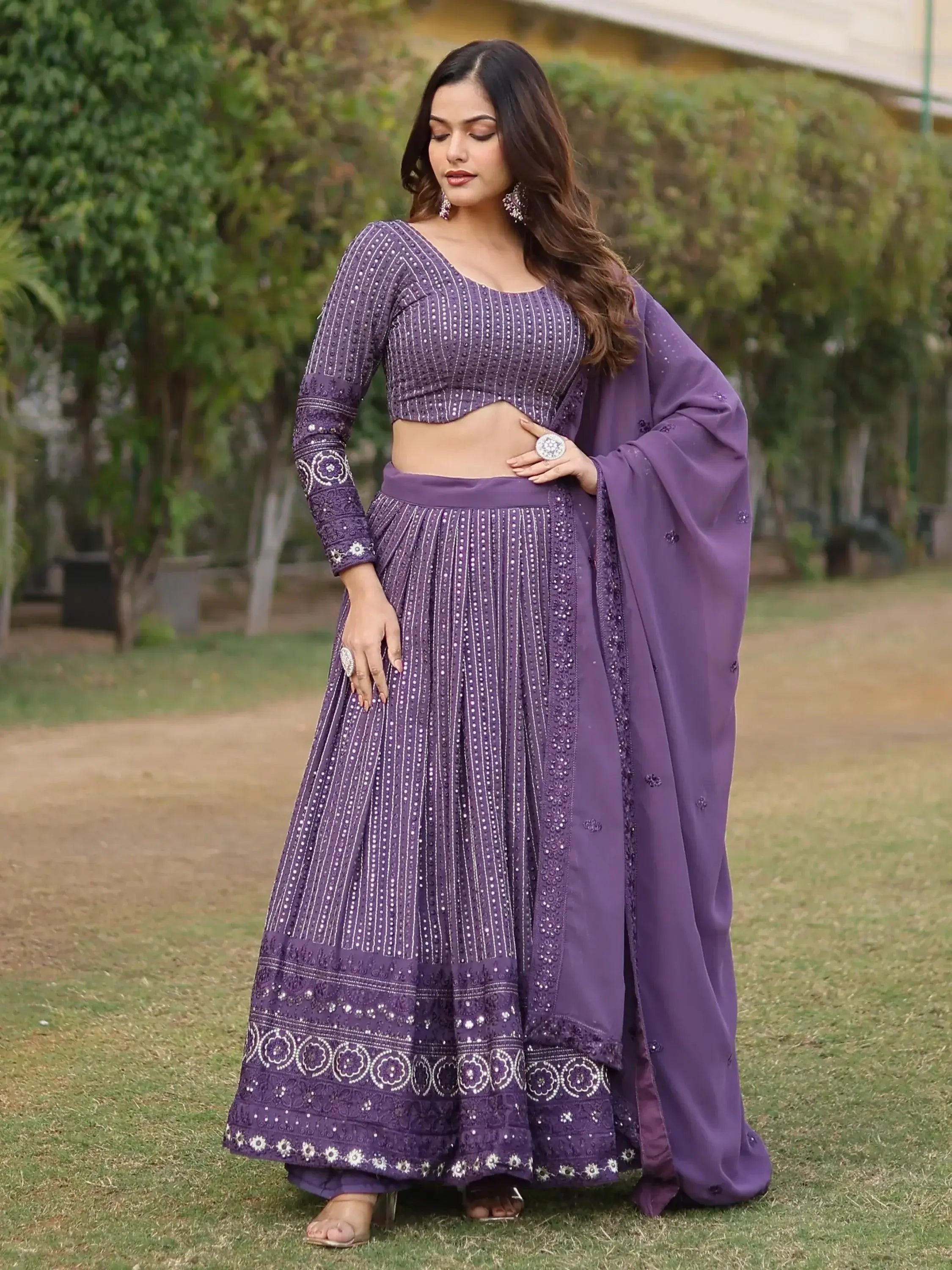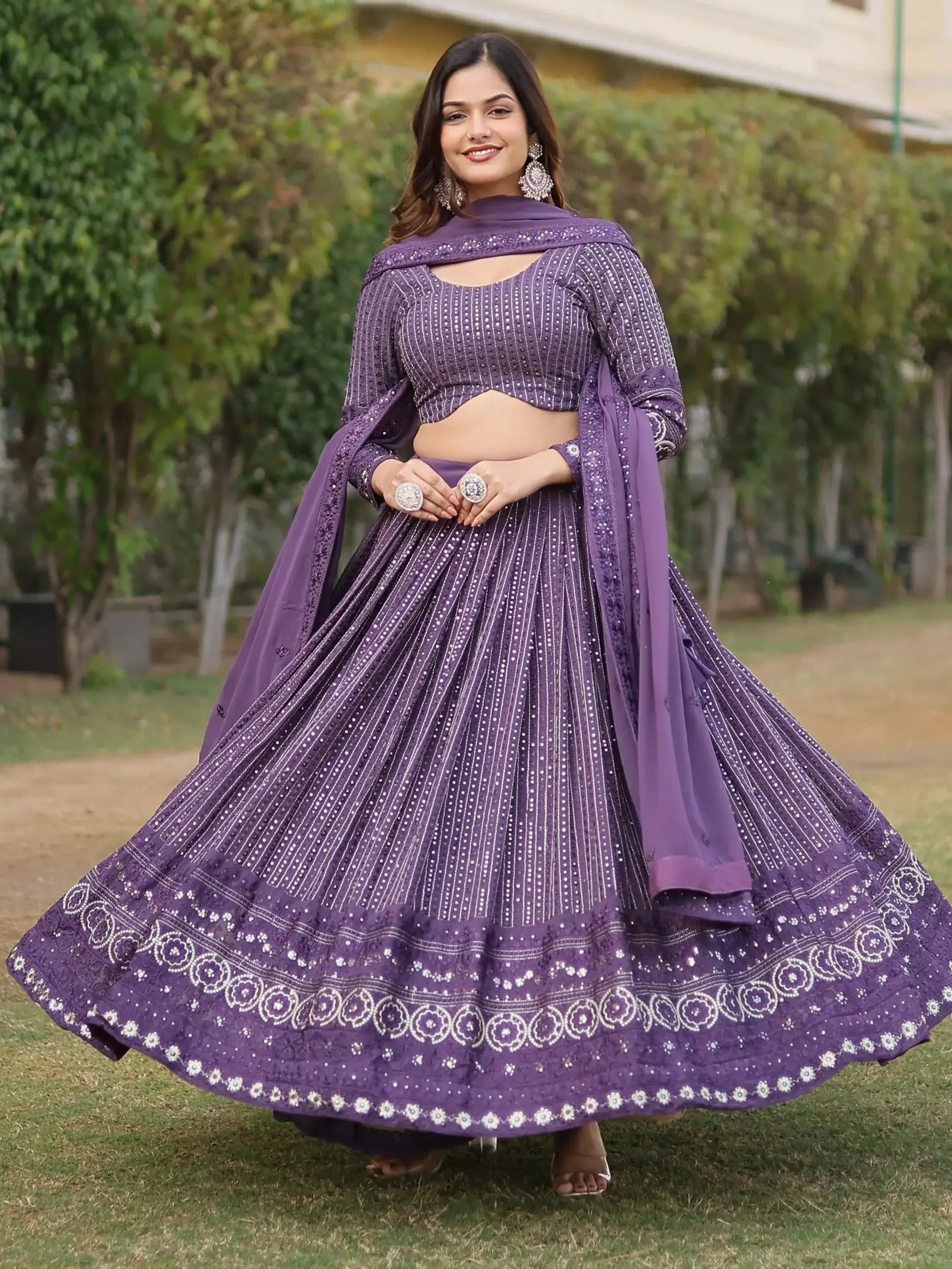 Introducing our captivating purple sequins georgette sangeet wears lehenga choli, a stunning ensemble perfect for weddings, functions, and special occasions. This exquisite set includes a purple color georgette lehenga with heavy sequins embroidered work, a matching georgette choli with intricate sequins embroidery, and a georgette dupatta adorned with multi-embroidered work and a delicate lace border.