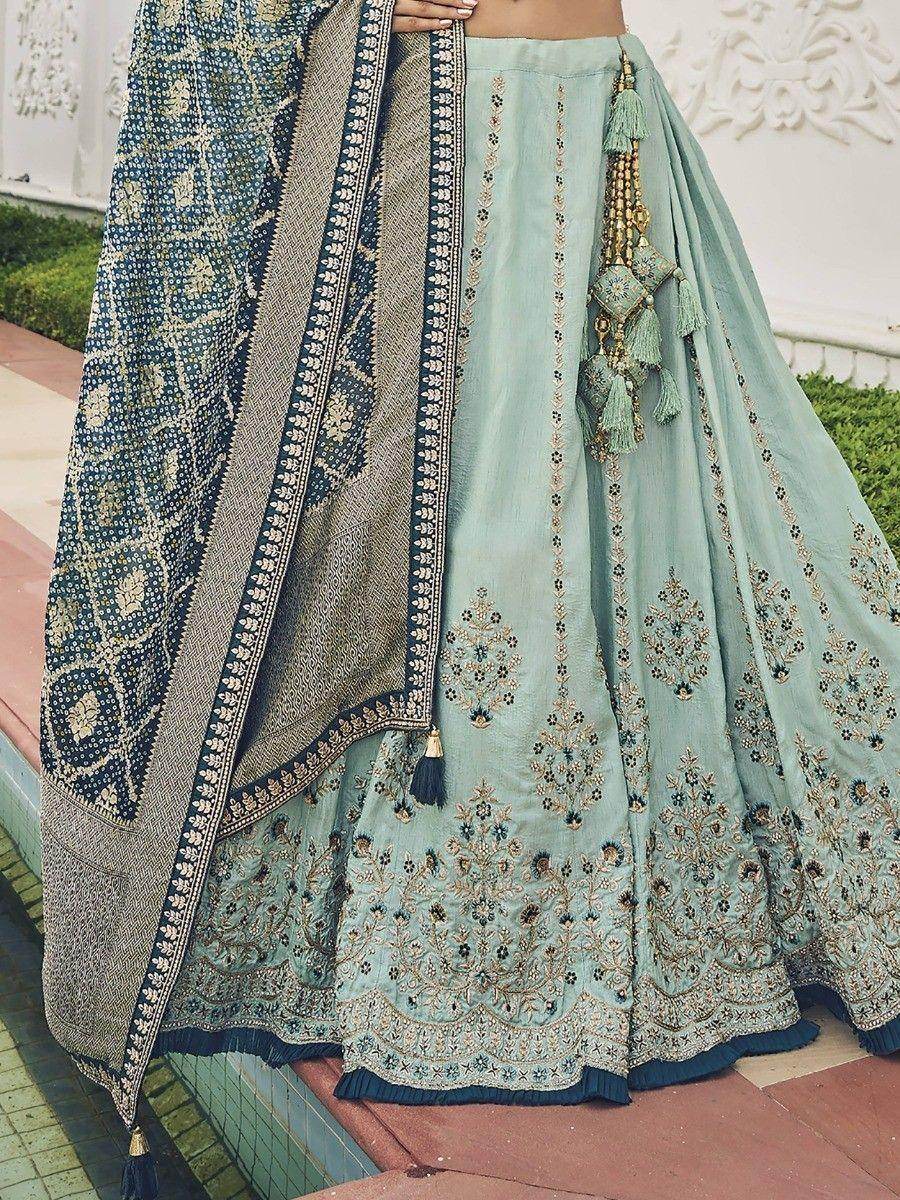 Introducing the captivating sky blue embroidered silk designer lehenga choli, a stunning ensemble that will make you the center of attention on any special occasion. Crafted with care and attention to detail, this exquisite lehenga choli set is the epitome of elegance and grace.