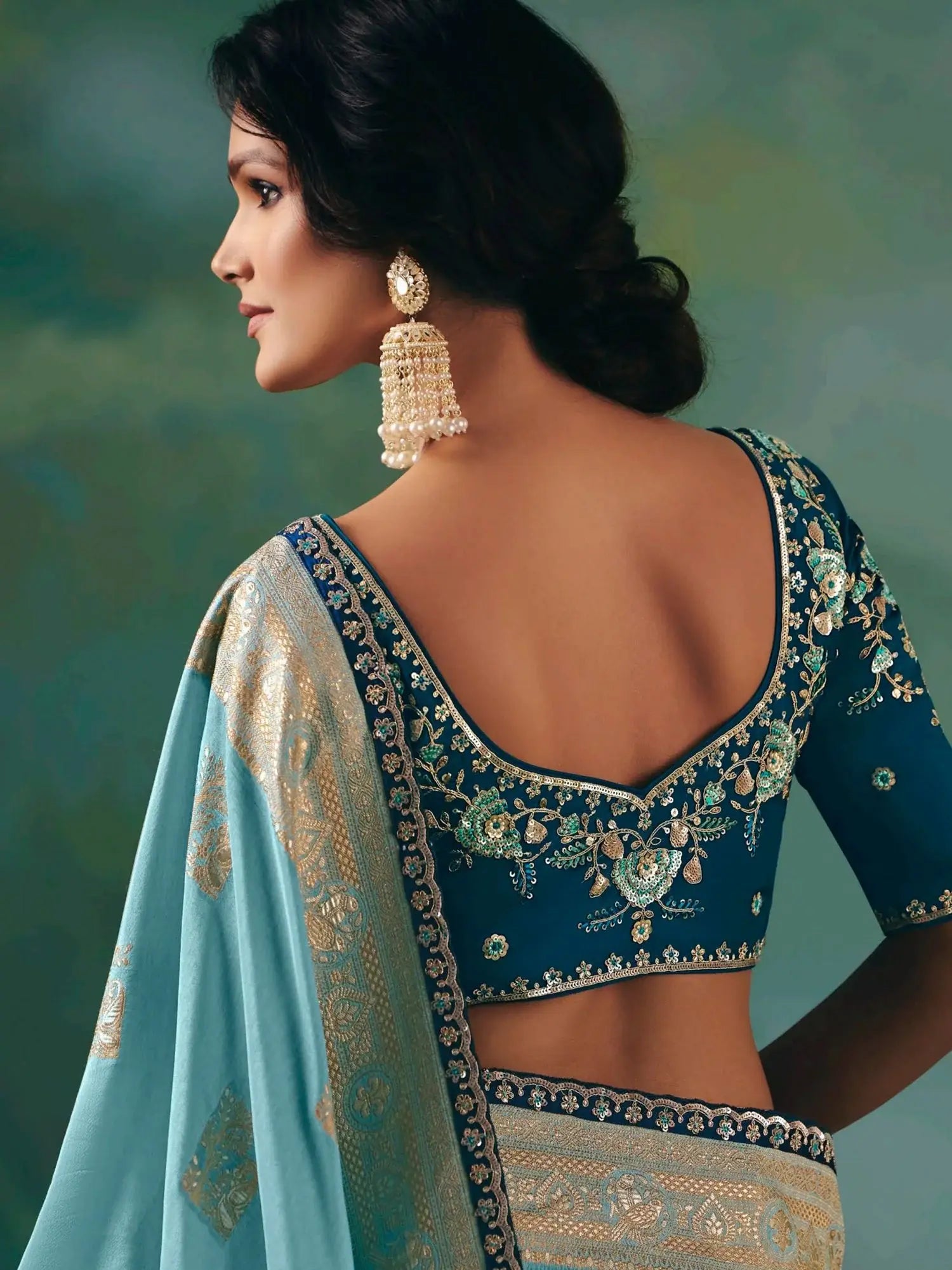 This sky-blue tissue saree is a vision of grace and sophistication. The soft fabric shines with a delicate sheen, adorned with intricate handwork for a regal finish.