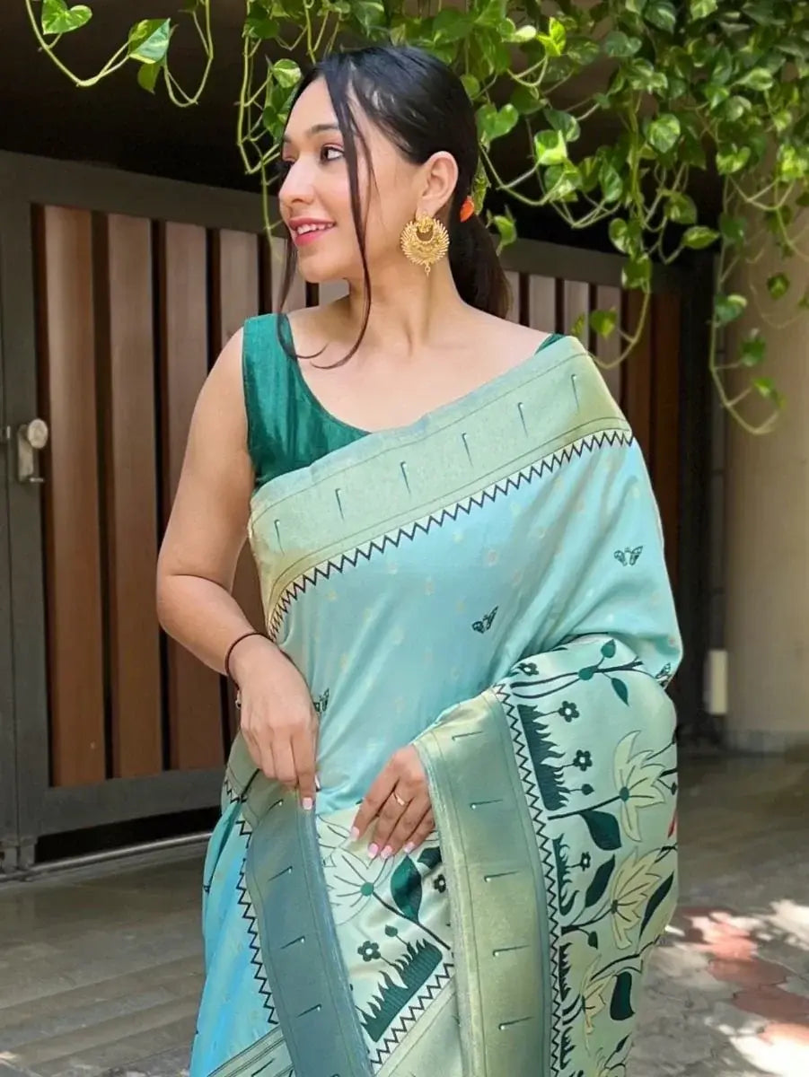 Immerse yourself in the sheer luxury and elegance of pure banarasi paithani silk with our Captivating Sky-Blue Zari Woven Banarasi Silk Reception Wear Saree With Blouse. This exquisite saree set is the perfect addition to your ethnic wardrobe, elevating your style and making you stand out at any special occasion.
