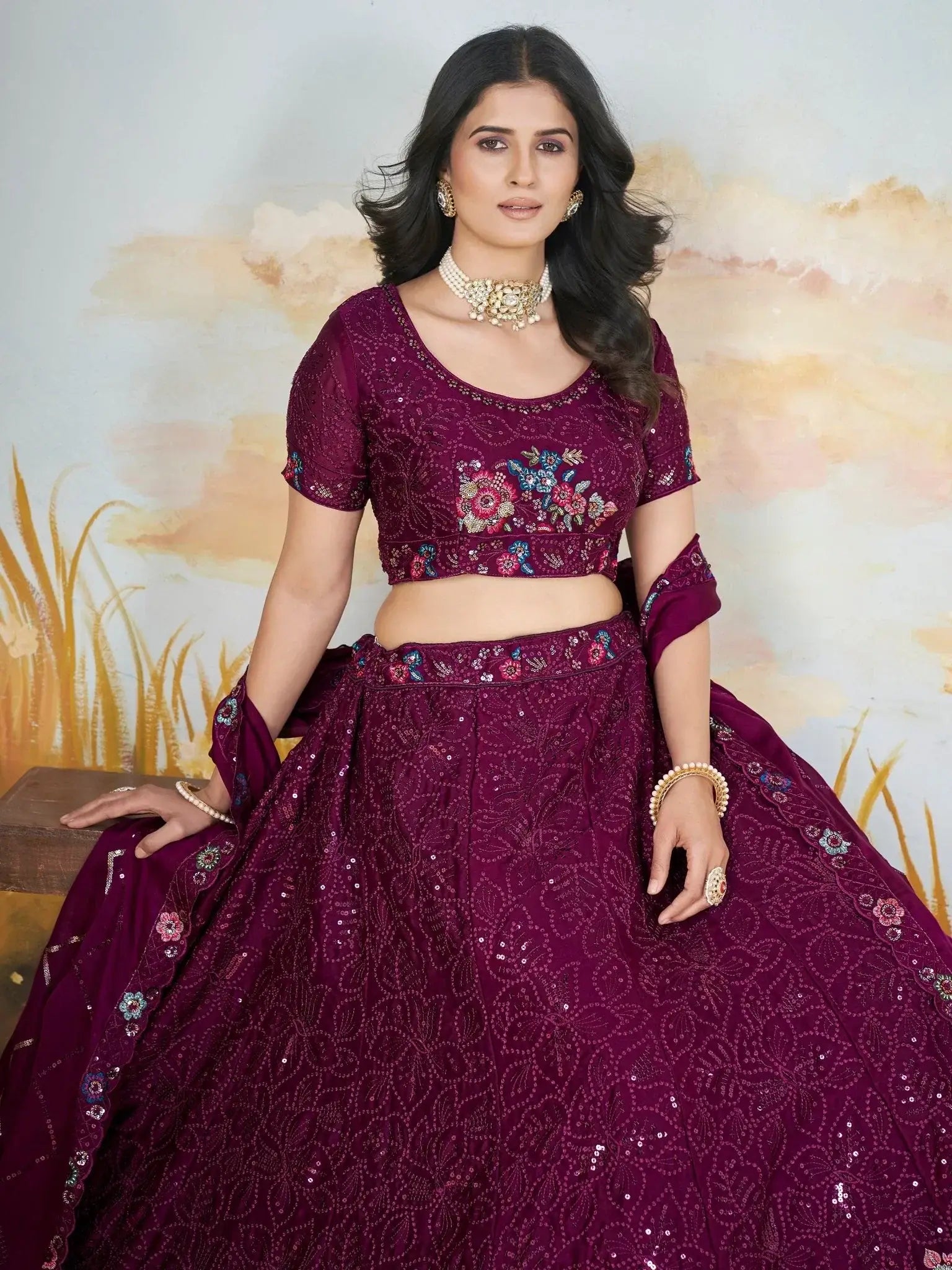 This stunning ensemble features a wine color chinon lehenga with intricate thread and floral embroidered work, as well as dazzling sequin work. The similar color chinon choli is adorned with the same exquisite detailing, creating a seamless and elegant look. To complete the ensemble, a similar color georgette dupatta with thread and floral embroidered work, sequin work, and attractive lace work is included for added sophistication.