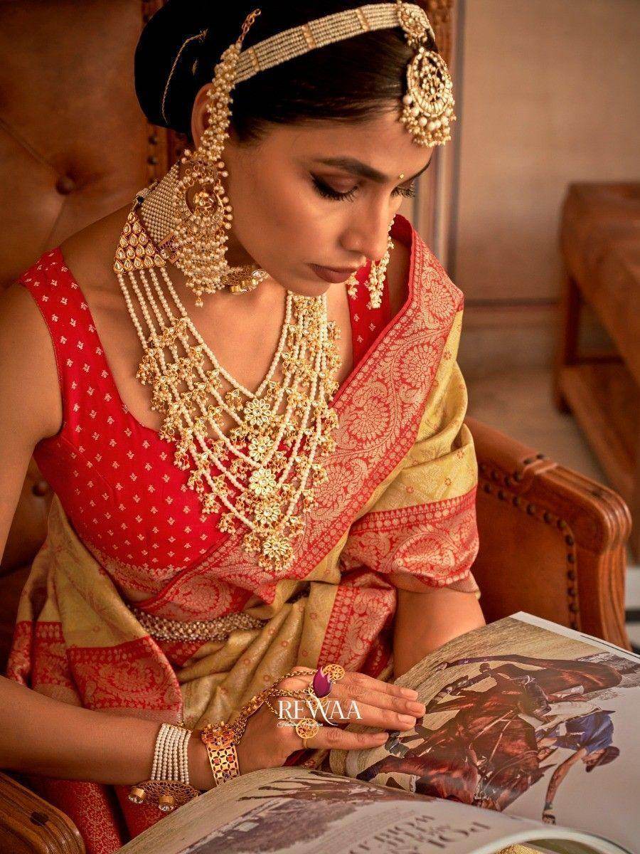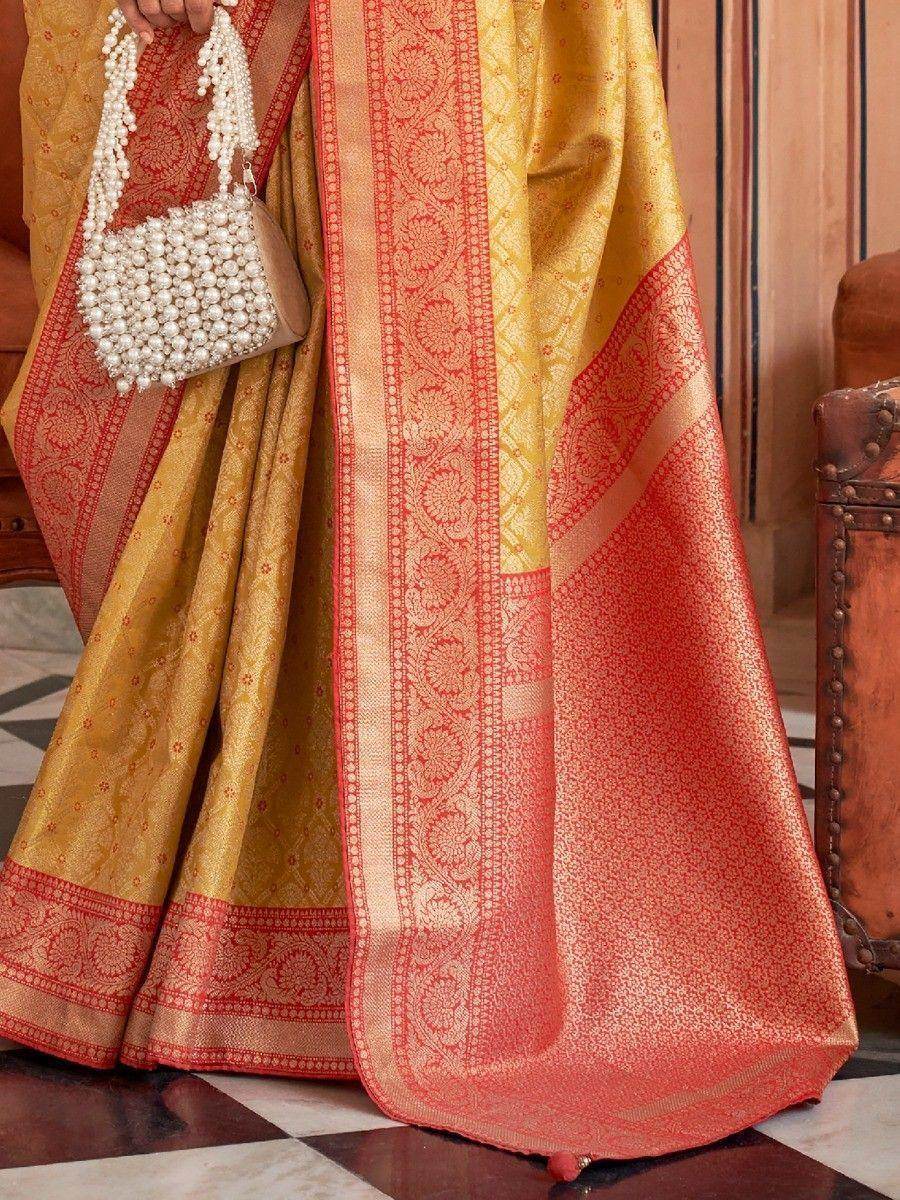 The captivating yellow zari woven silk haldi wear saree with blouse is a must-have addition to your ethnic wear collection. Its stunning design, vibrant color, and intricate work make it suitable for weddings, festivals, and other special occasions. Step into the spotlight and indulge in the beauty of this saree.