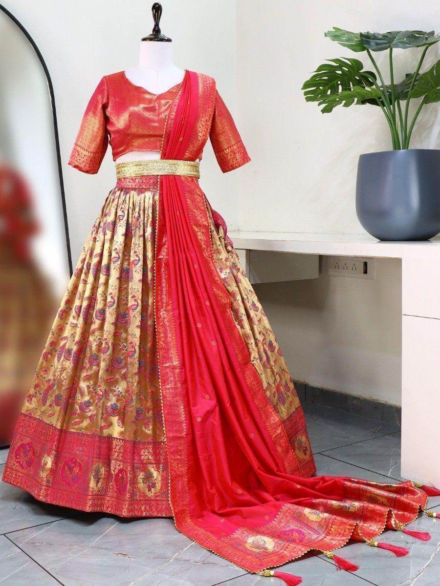 Crafted from high-quality paithani silk material, the lehenga features a beautiful combination of beige and pink colors. The zari weaving work adds a touch of glamour and sophistication to the overall look. The lehenga is semi-stitched up to 42 inches, ensuring a comfortable fit for various body types. With a flair of 3.5 meters and a length of 41 inches, the lehenga promises to make a grand statement.