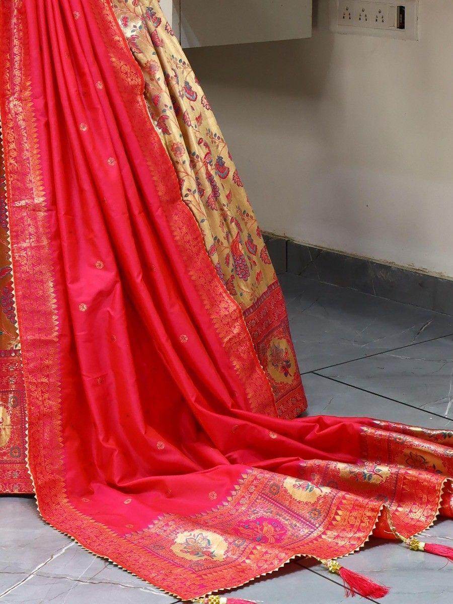 Accompanying the lehenga is a pink paithani silk choli, also adorned with zari weaving work. The choli comes with an unstitched 1.00-meter material, allowing you to customize it according to your preferences and measurements. Completing the ensemble is a pink paithani silk dupatta with intricately printed work on both sides. The dupatta is accentuated with a piping border and tassels, adding an extra touch of elegance.