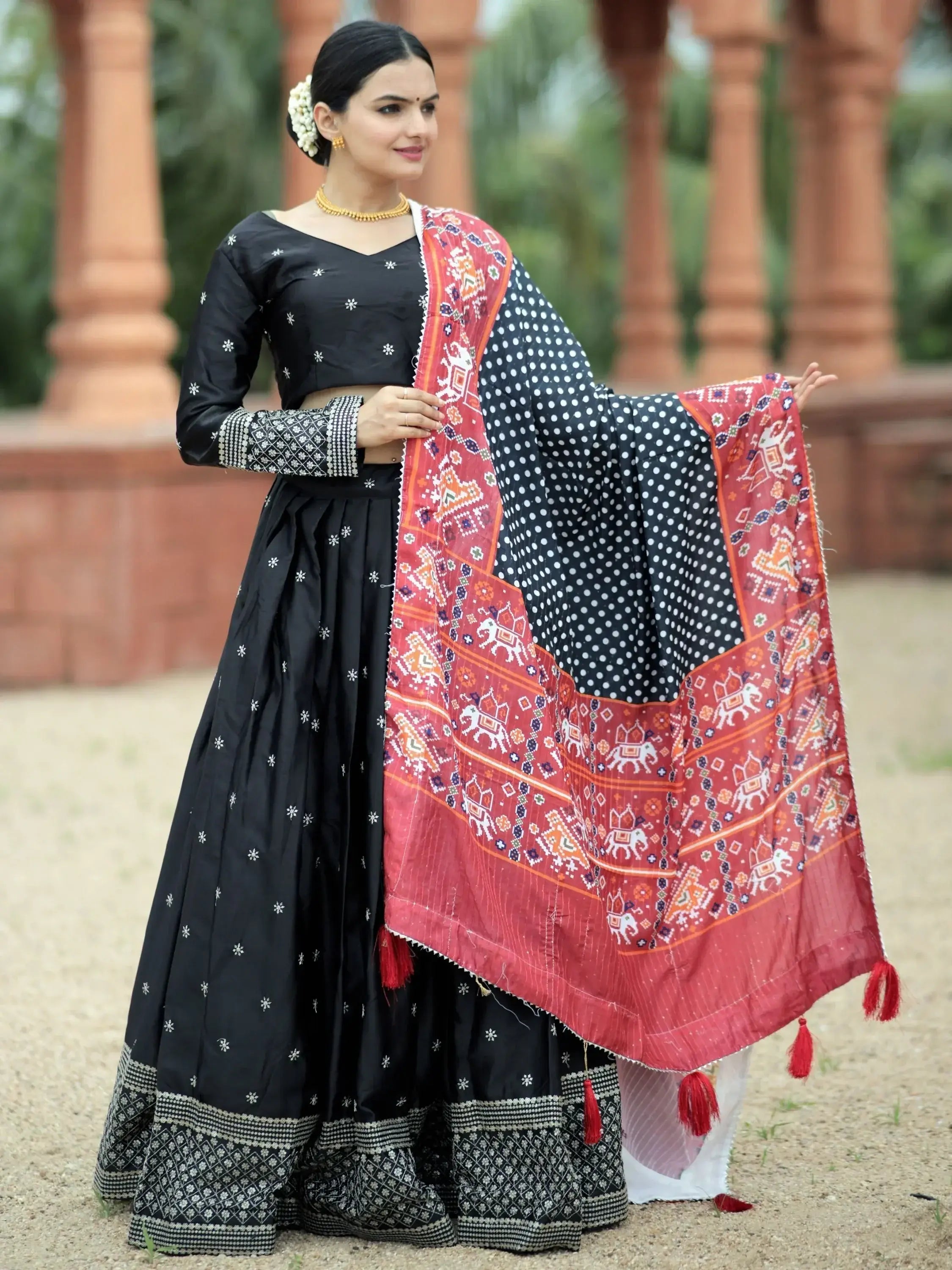 For this captivating black sequins silk festival wear a lehenga choli with a dupatta. Perfect for weddings, festivals, and special occasions, this ensemble exudes elegance and charm. The black lehenga features intricate sequins embroidery work, while the matching choli and dupatta complete the look with their detailed embellishments.