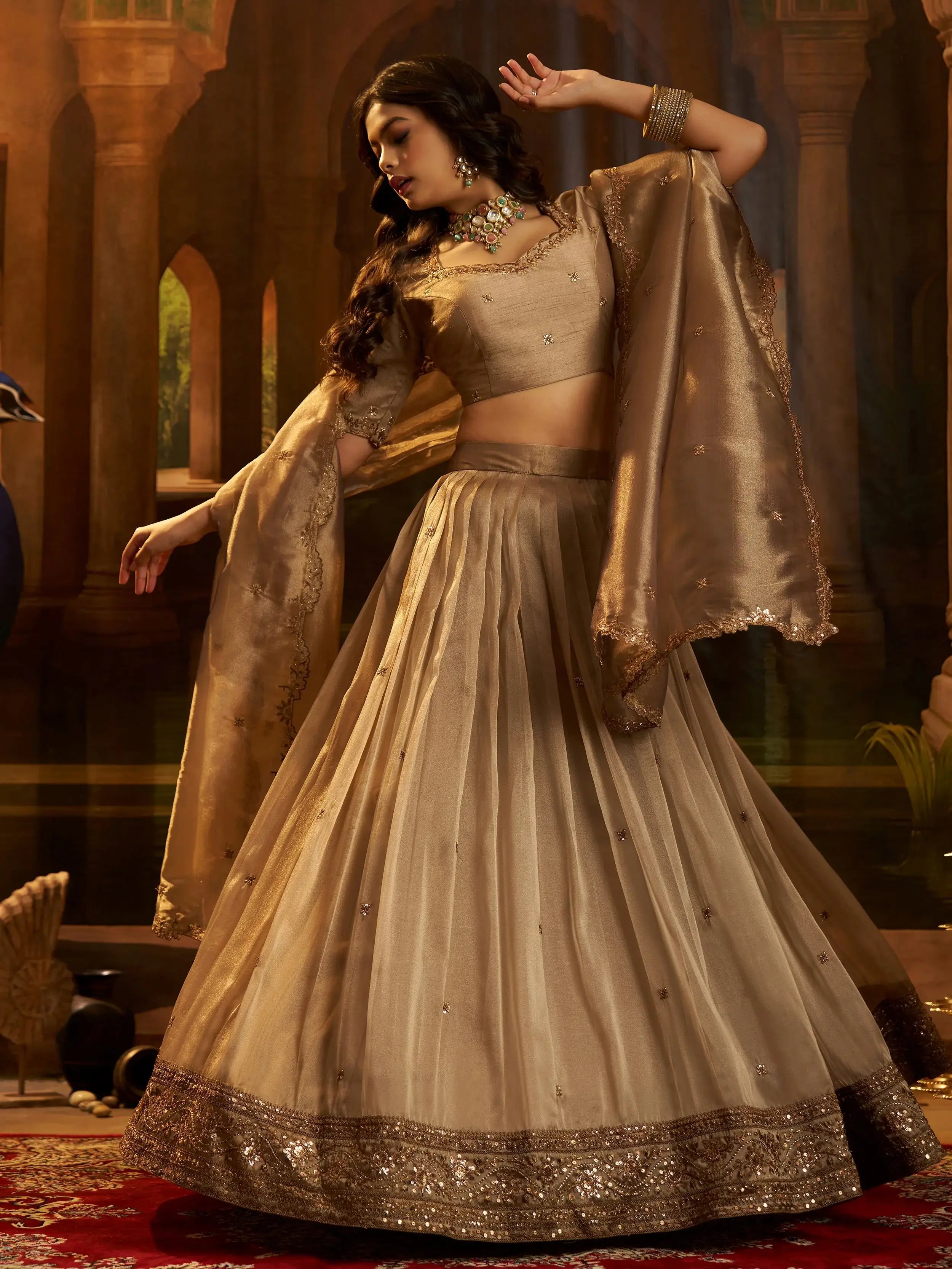 The lehenga comes in an elegant champagne golden beige shade, crafted from pure organza that flows gracefully with every movement. It is beautifully adorned with intricate sequins, zari, and dori embroidery, creating a rich yet refined festive appeal.