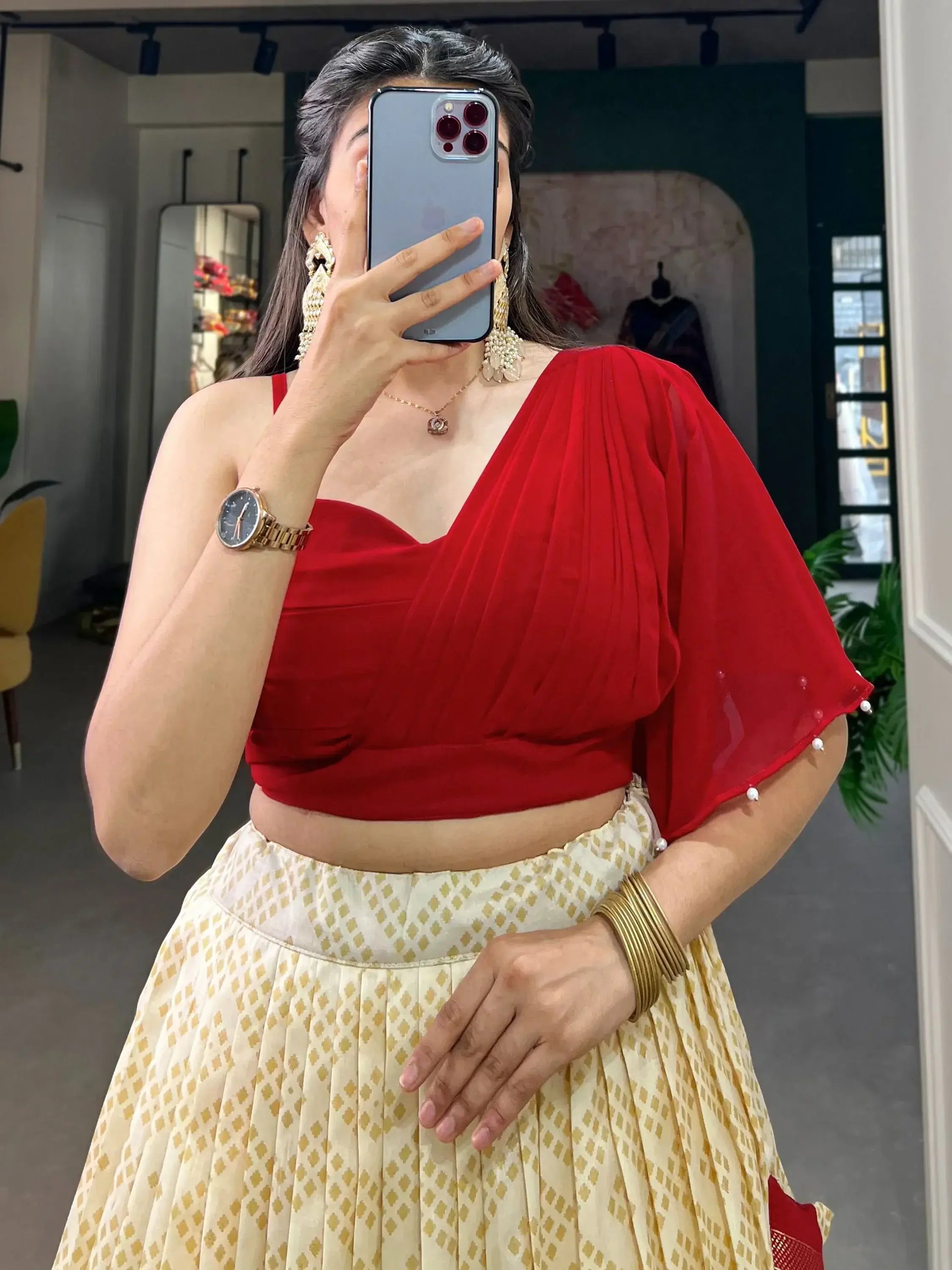 Complementing the lehenga is a vibrant red georgette crop top, adding a bold contrast to the subtle cream hue of the lehenga. The simplicity of the crop top allows the intricate details of the lehenga to take center stage, creating a harmonious balance of colors and textures. Fully stitched and boasting a 3.80-meter flair with a lehenga length of 42 inches, this ensemble offers a flawless fit and effortless elegance.