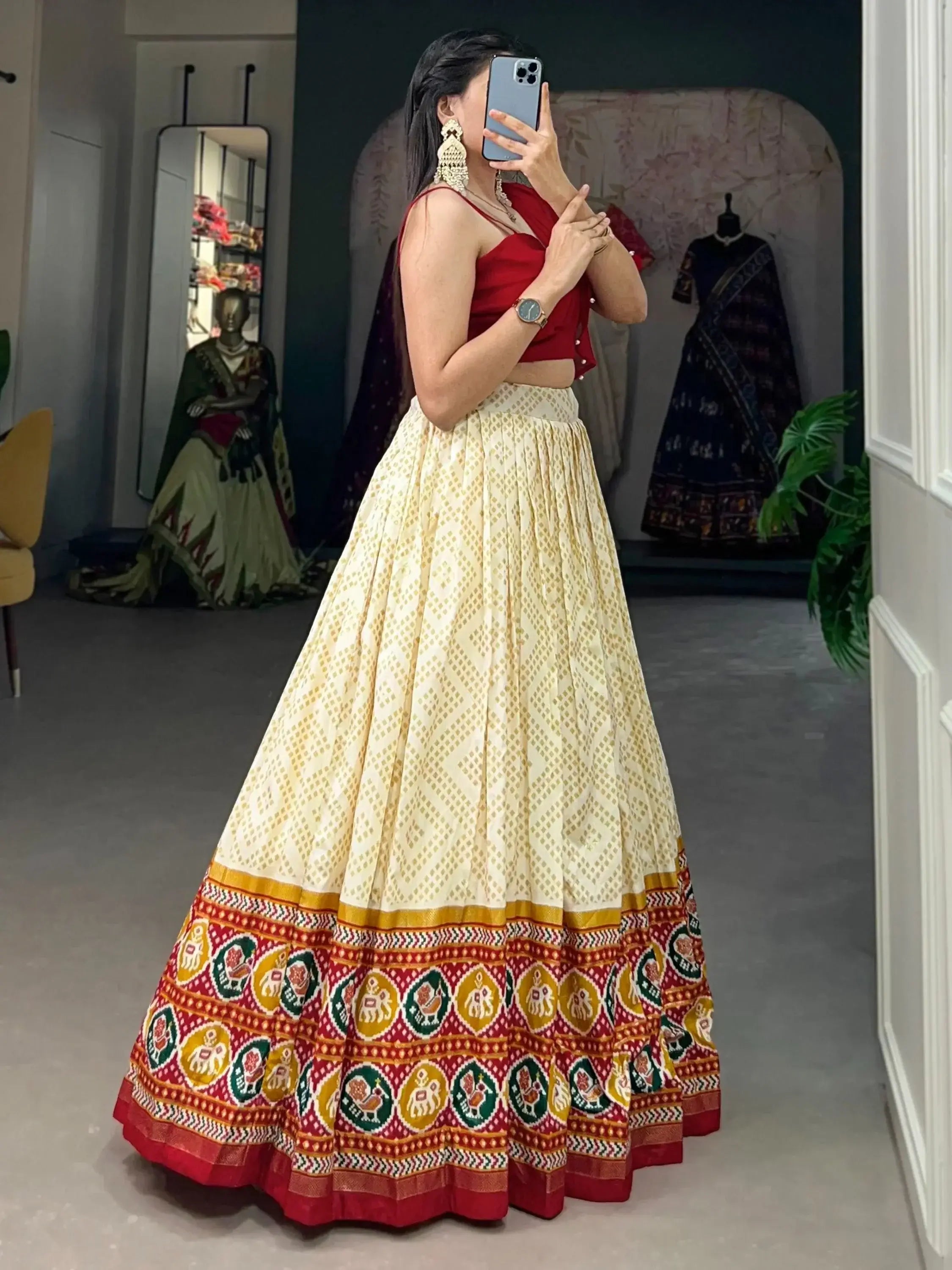 Indulge in the allure of this cream-color tussar silk lehenga and embrace the magic of Indian craftsmanship. With its stunning bandhani and patola print adorned with foil work, this ensemble is a celebration of tradition and style.
