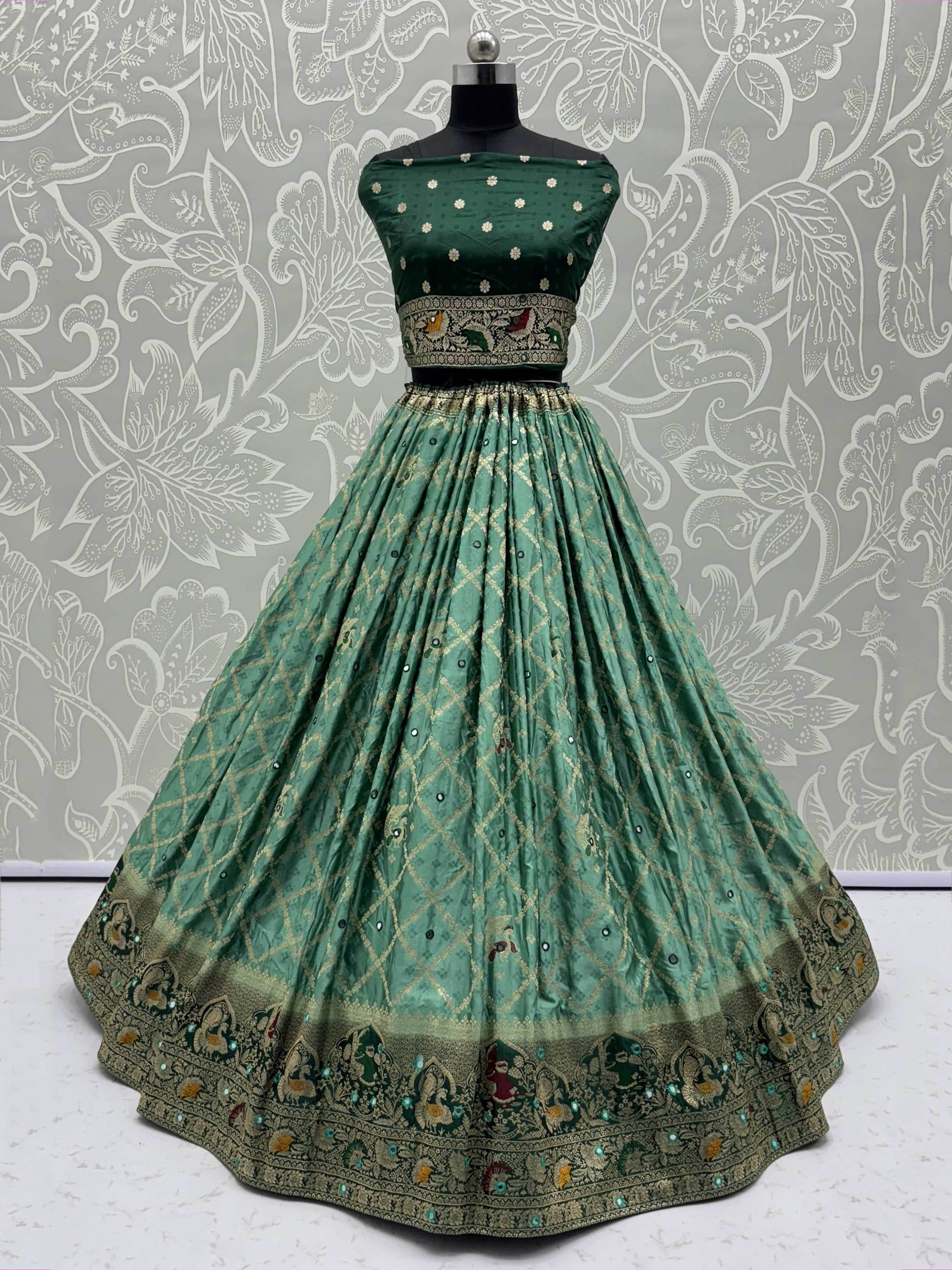 This stunning georgette satin lehenga choli comes in a rich bottle green tone with intricate weaving and sober mirror work. The lehenga features golden zari woven motifs paired with multicolor peacock and dancing figure designs on the border, adding a regal touch.