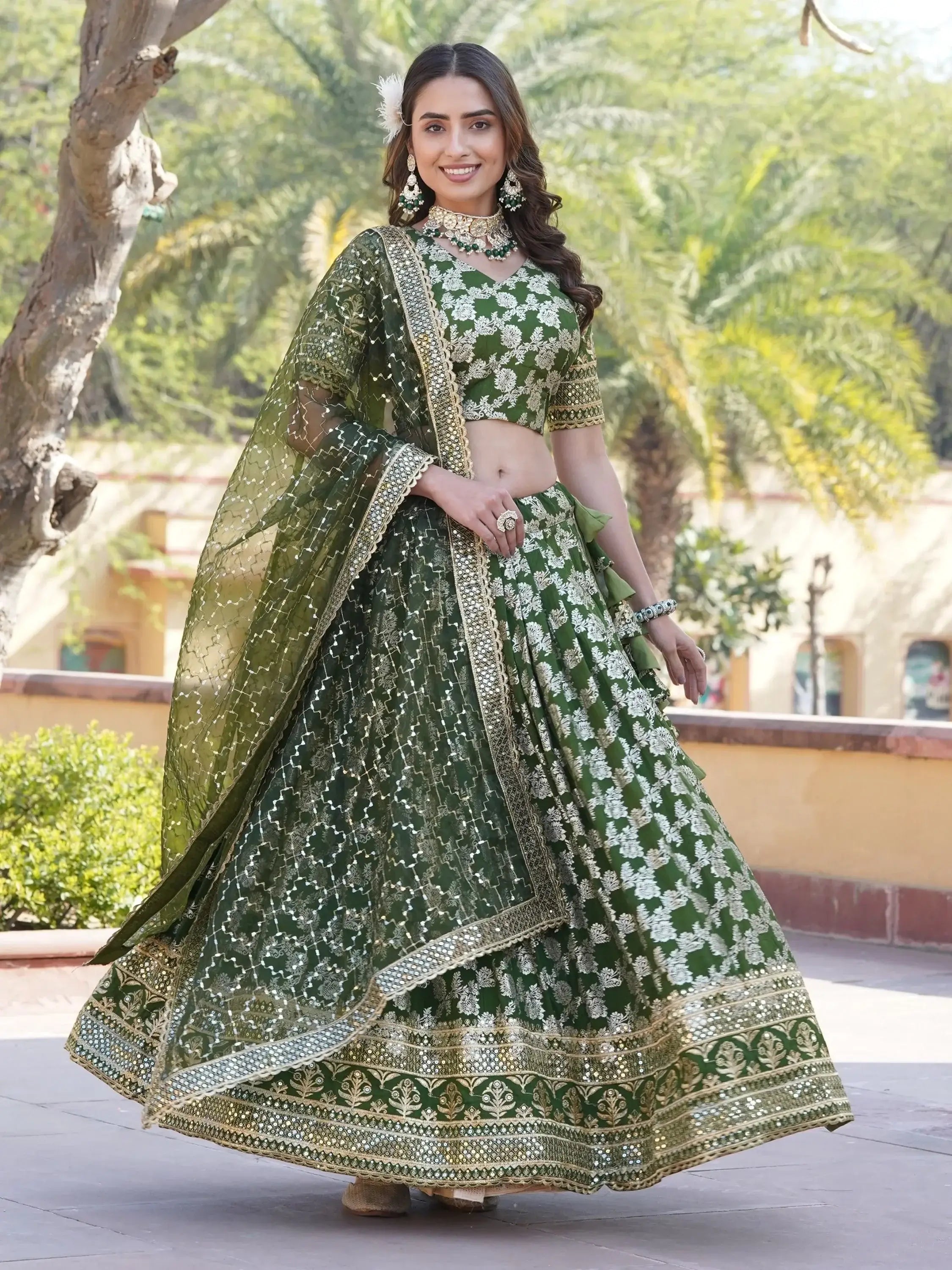 Introducing our stunning "charming green embroidered jacquard mehendi wear lehenga choli", the perfect outfit for all your special occasions. This green lehenga set features intricate sequin and embroidered work on a luxurious jacquard fabric, giving it a rich and elegant look. The set includes a green color jacquard lehenga with a 3.5-meter flair, a matching jacquard choli with sequin and embroidered work, and a beautiful organza dupatta with sequin and embroidered lace borderwork.