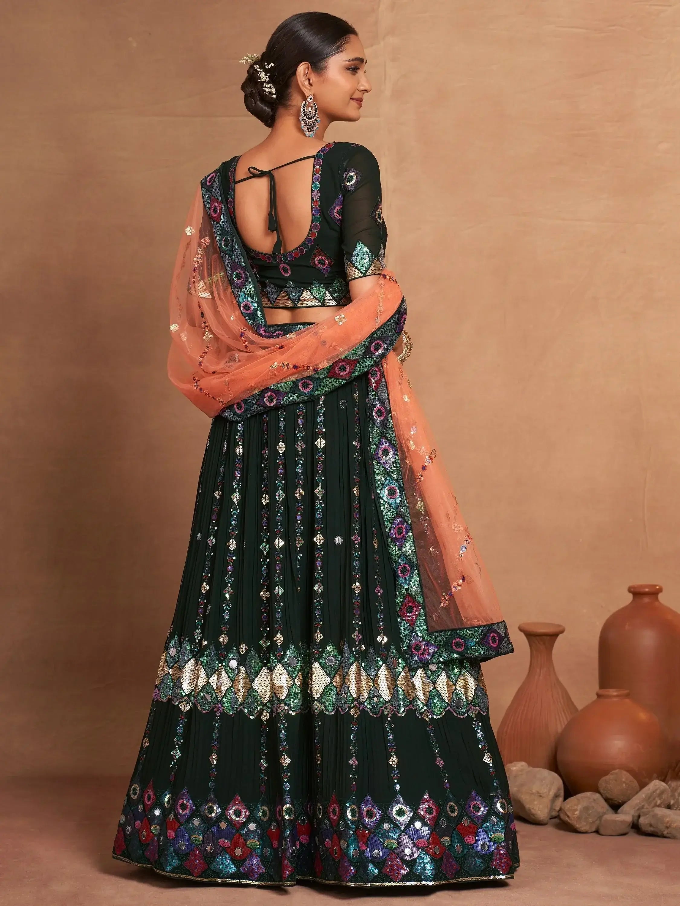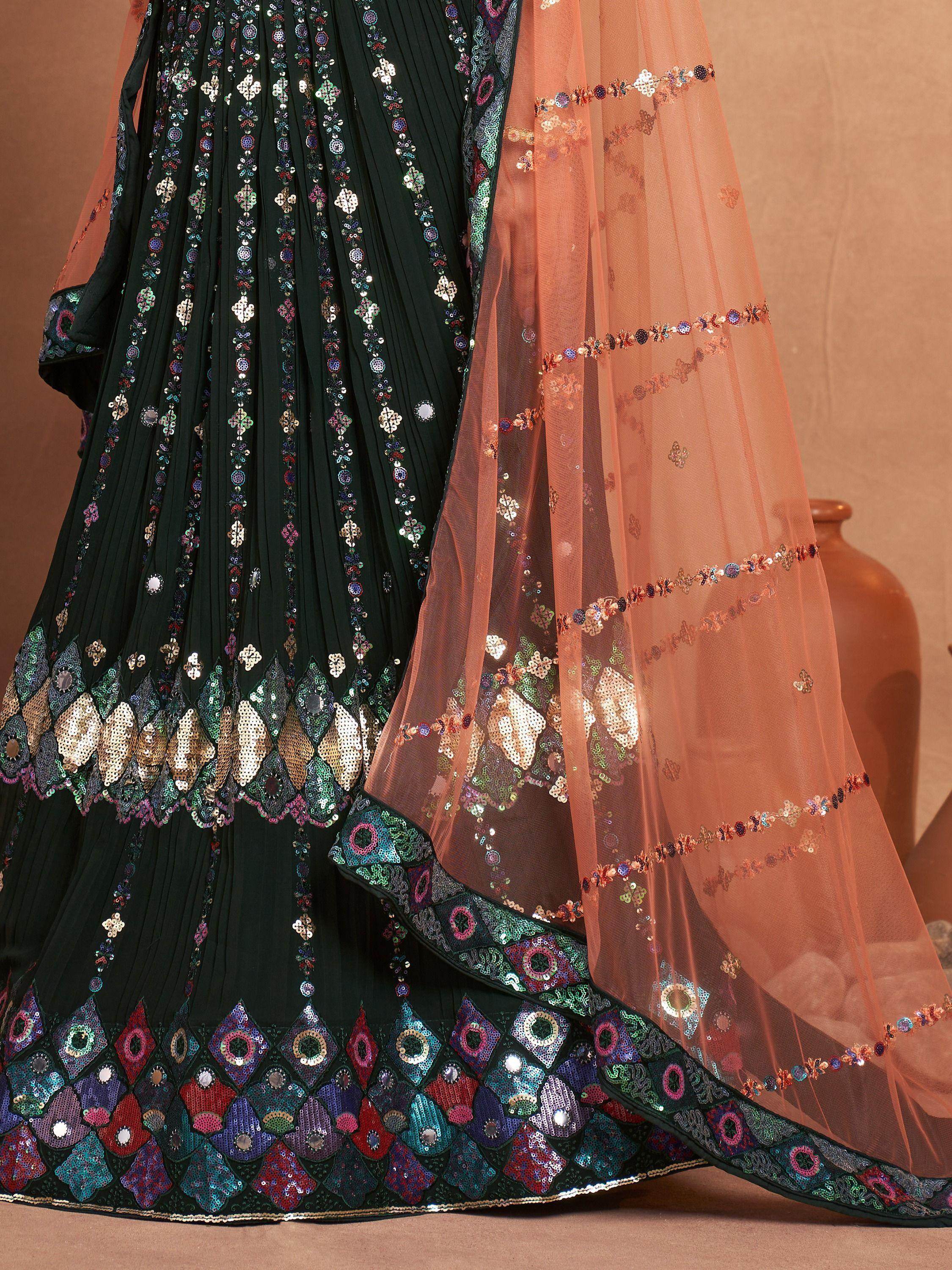 Drape this charming green sequin georgette lehenga choli at events, functions, and occasions to make a lasting impression. Pair it with a trendy bun and a set of heels for a stylish and memorable look. Elevate your ethnic wardrobe with this captivating ensemble and be ready to turn heads wherever you go.