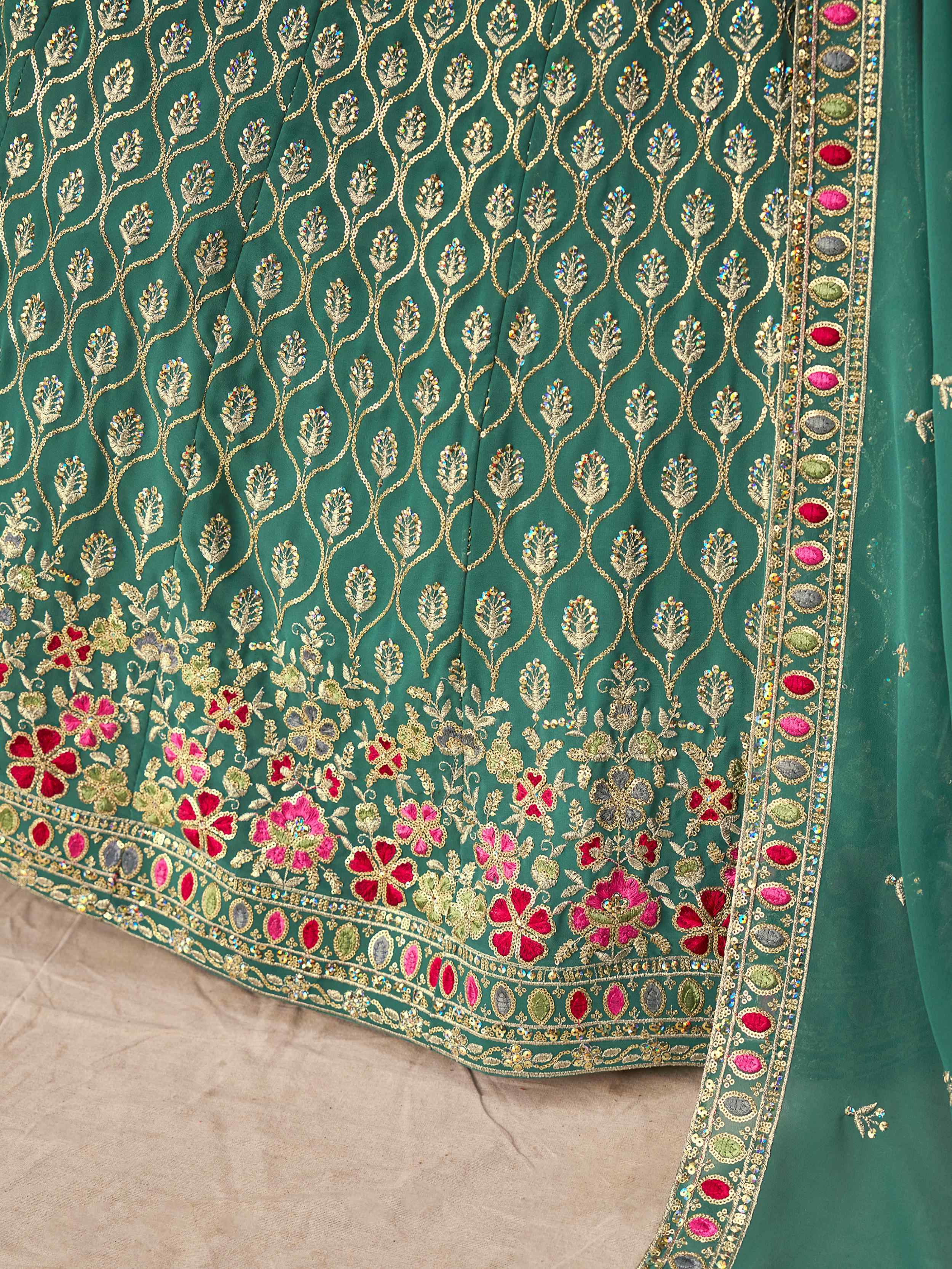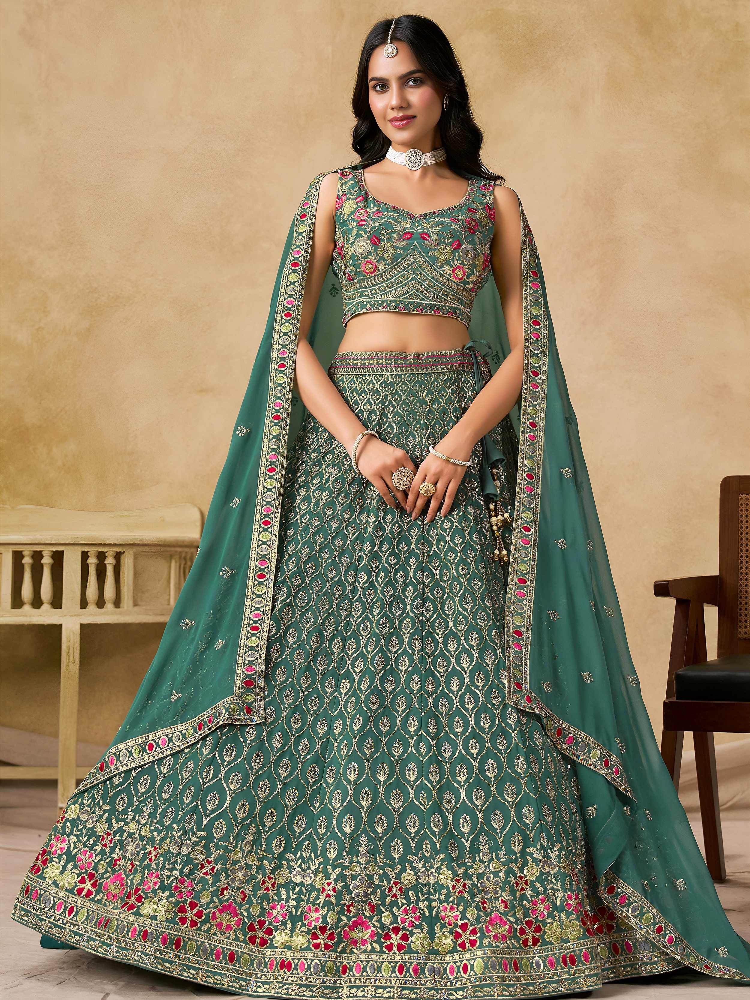 This gorgeous wedding-wear lehenga comes in a rich green-blue shade crafted from premium georgette fabric. It features beautiful sequins and zari-embroidered floral motifs that enhance its luxurious ethnic appeal.