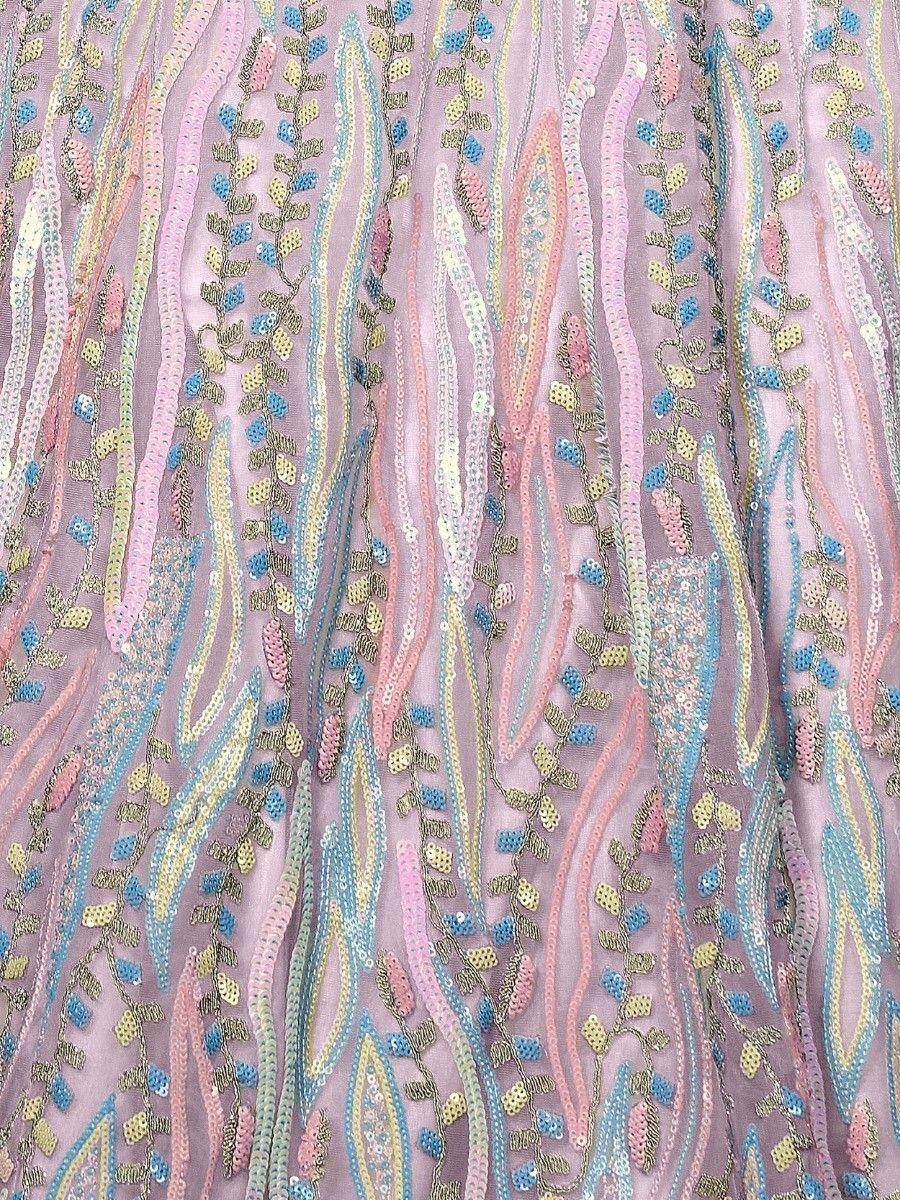 This lehenga is its lavishly designed organza material. The lavender color adds a touch of femininity and grace, while the sequin and embroidered work adds a touch of sparkle and sophistication. The detailing on the lehenga is truly intricate, with different patterns and styles of heavy embroidery used to create a stunning visual appeal.