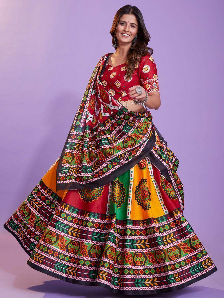 Make this navratri unforgettable with your dazzling presence in this beautiful attire. The Charming Multi-Coloured Hand-Block Cotton Navratri Lehenga Choli is available for immediate purchase, allowing you to prepare for the festivities without any delays.