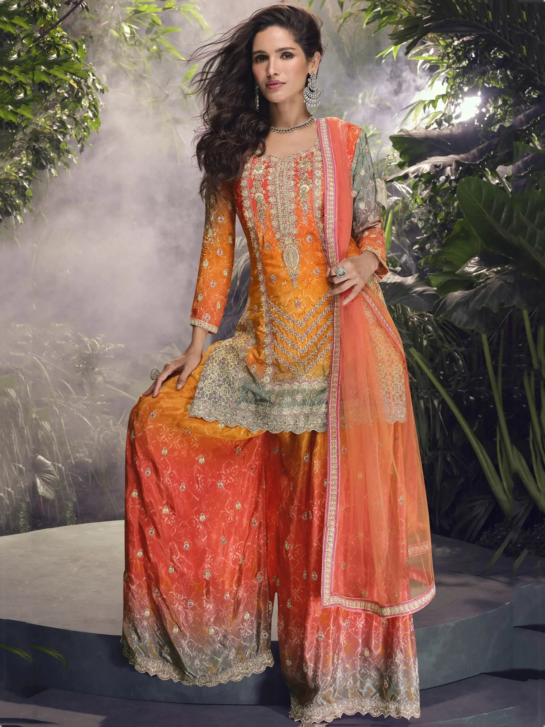 This orange palazzo suit includes its vibrant color, luxurious fabric, and exquisite workmanship. The combination of different embellishments adds depth and texture to the outfit, creating a rich and opulent look. You can easily accessorize this ensemble to personalize your style and make a statement at any occasion.